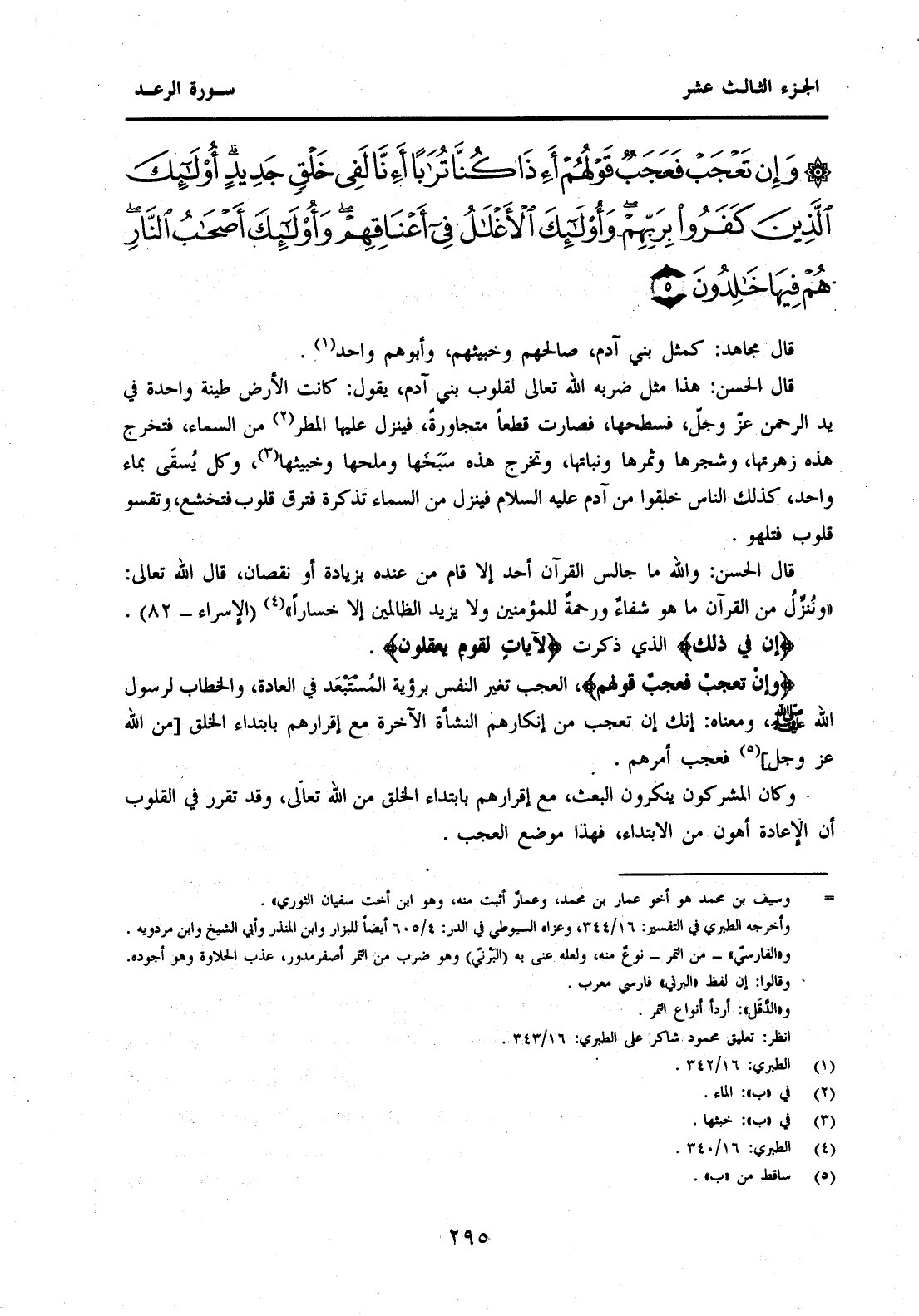 {وَإِنْ تَعْجَبْ فَعَجَبٌ قَوْلُهُمْ أَئِذَا كُنَّا تُرَابًا أَئِنَّا لَفِي خَلْقٍ جَدِيدٍ أُولَئِكَ الَّذِينَ كَفَرُوا بِرَبِّهِمْ وَأُولَئِكَ الْأَغْلَالُ فِي أَعْنَاقِهِمْ وَأُولَئِكَ أَصْحَابُ النَّارِ هُمْ فِيهَا خَالِدُونَ (5) } .