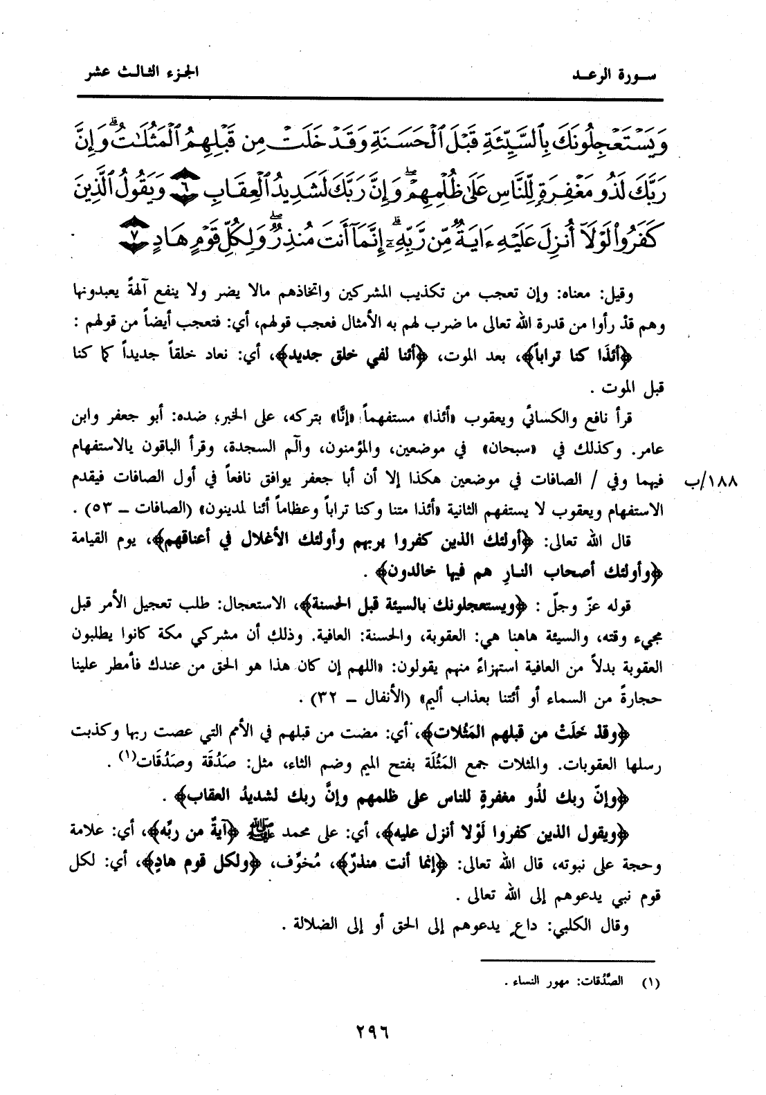 {وَيَسْتَعْجِلُونَكَ بِالسَّيِّئَةِ قَبْلَ الْحَسَنَةِ وَقَدْ خَلَتْ مِنْ قَبْلِهِمُ الْمَثُلَاتُ وَإِنَّ رَبَّكَ لَذُو مَغْفِرَةٍ لِلنَّاسِ عَلَى ظُلْمِهِمْ وَإِنَّ رَبَّكَ لَشَدِيدُ الْعِقَابِ (6) وَيَقُولُ الَّذِينَ كَفَرُوا لَوْلَا أُنْزِلَ عَلَيْهِ آيَةٌ مِنْ رَبِّهِ إِنَّمَا أَنْتَ مُنْذِرٌ وَلِكُلِّ قَوْمٍ هَادٍ (7) } .