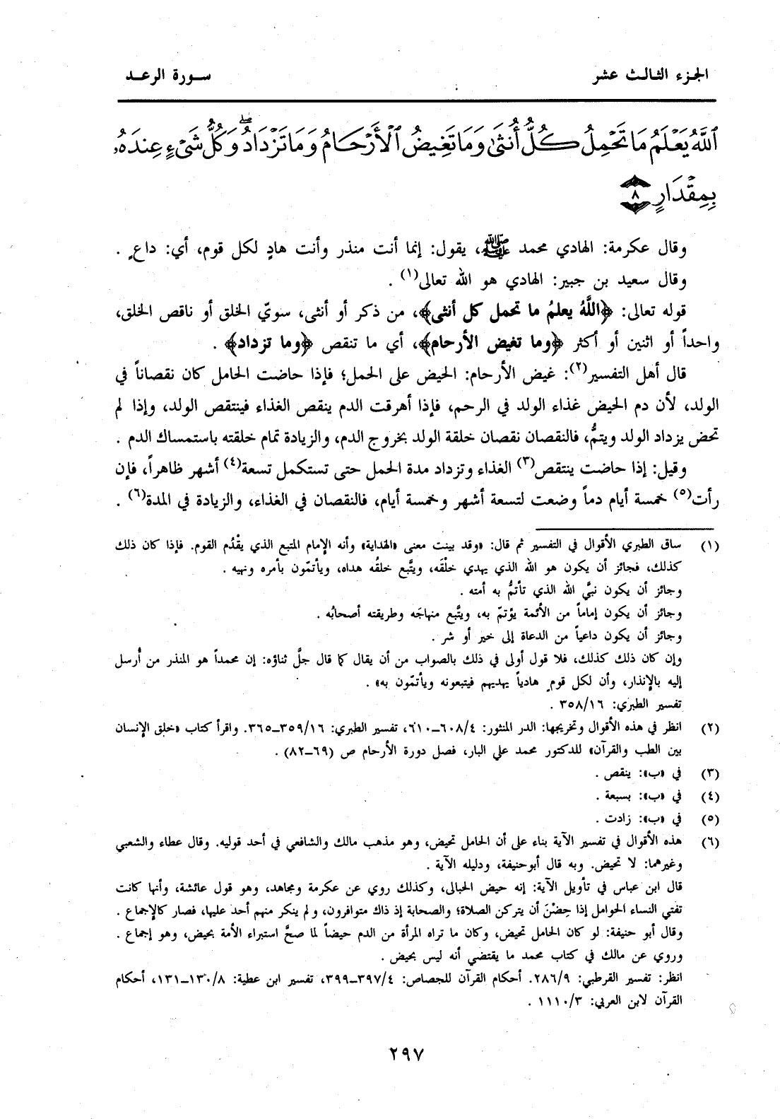 قَالَ أَهْلُ التَّفْسِيرِ (2) غَيْضُ الْأَرْحَامِ: الْحَيْضُ عَلَى الْحَمْلِ؛ فَإِذَا حَاضَتِ الْحَامِلُ كَانَ نُقْصَانًا فِي الْوَلَدِ، لِأَنَّ دَمَ الْحَيْضِ غِذَاءُ الْوَلَدِ فِي الرَّحِمِ، فَإِذَا أَهْرَقَتِ الدَّمَ يَنْقُصُ الْغِذَاءُ فَيَنْتَقِصُ الْوَلَدُ، وَإِذَا لَمْ تَحِضْ يَزْدَادُ الْوَلَدُ وَيَتِمُّ، فَالنُّقْصَانُ نُقْصَانُ خِلْقَةِ الْوَلَدِ بِخُرُوجِ الدَّمِ، وَالزِّيَادَةُ تَمَامُ خِلْقَتِهِ بِاسْتِمْسَاكِ الدَّمِ.