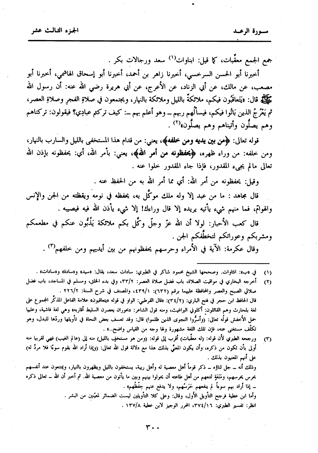 (3) ورجحه الطبري لأن قوله: (له معقبات) أقرب إلى قوله: (ومن هو مستخف بالليل) منه إلى (عالم الغيب) فهي لقربها منه أولى بأن تكون من ذكره، وأن يكون المعنى بذلك هذا مع دلالة قول الله تعالى: (وإذا أراد الله بقوم سوءا فلا مرد له) على أنهم المعنيون بذلك. وذلك أنه -جل ثناؤه- ذكر قوما أهل معصية له وأهل ريبة، يستخفون بالليل ويظهرون بالنار، ويمتنعون عند أنفسهم بحرس يحرسهم، ومنعة تمنعهم من أهل طاعته أن يحولوا بينهم وبين ما يأتون من معصية الله. ثم أخبر أن الله -تعالى ذكره- إذا أراد بهم سوءا لم ينفعهم حرسهم، ولا يدفع عنهم حفظهم". وأما ابن عطية فرجح التأويل الأول، وقال: وعلى كلا التأويلين ليست الضمائر لمعينين من البشر. انظر: تفسير الطبري: 16 / 374، المحرر الوجيز لابن عطية 8 / 137.