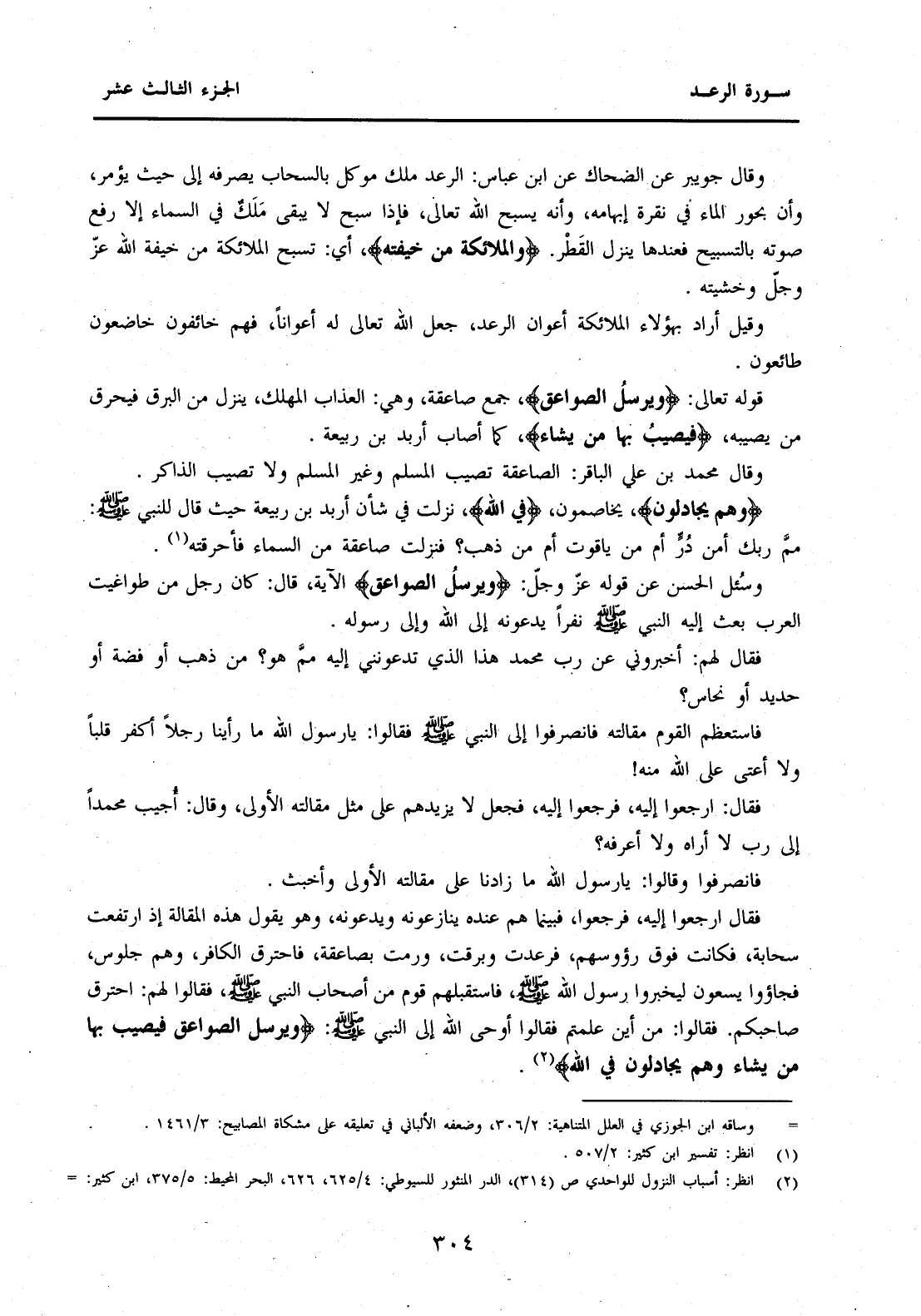 قَوْلُهُ تَعَالَى: {وَيُرْسِلُ الصَّوَاعِقَ} جَمْعُ صَاعِقَةٍ، وَهِيَ: الْعَذَابُ الْمُهْلِكُ، يَنْزِلُ مِنَ الْبَرْقِ فَيَحْرِقُ مَنْ يُصِيبُهُ، {فَيُصِيبُ بِهَا مَنْ يَشَاءُ} كَمَا أَصَابَ أَرْبَدَ بْنَ رَبِيعَةَ. وَقَالَ مُحَمَّدُ بْنُ عَلِيٍّ الْبَاقِرُ: الصَّاعِقَةُ تُصِيبُ الْمُسْلِمَ وَغَيْرَ الْمُسْلِمِ وَلَا تُصِيبُ الذَّاكِرَ.