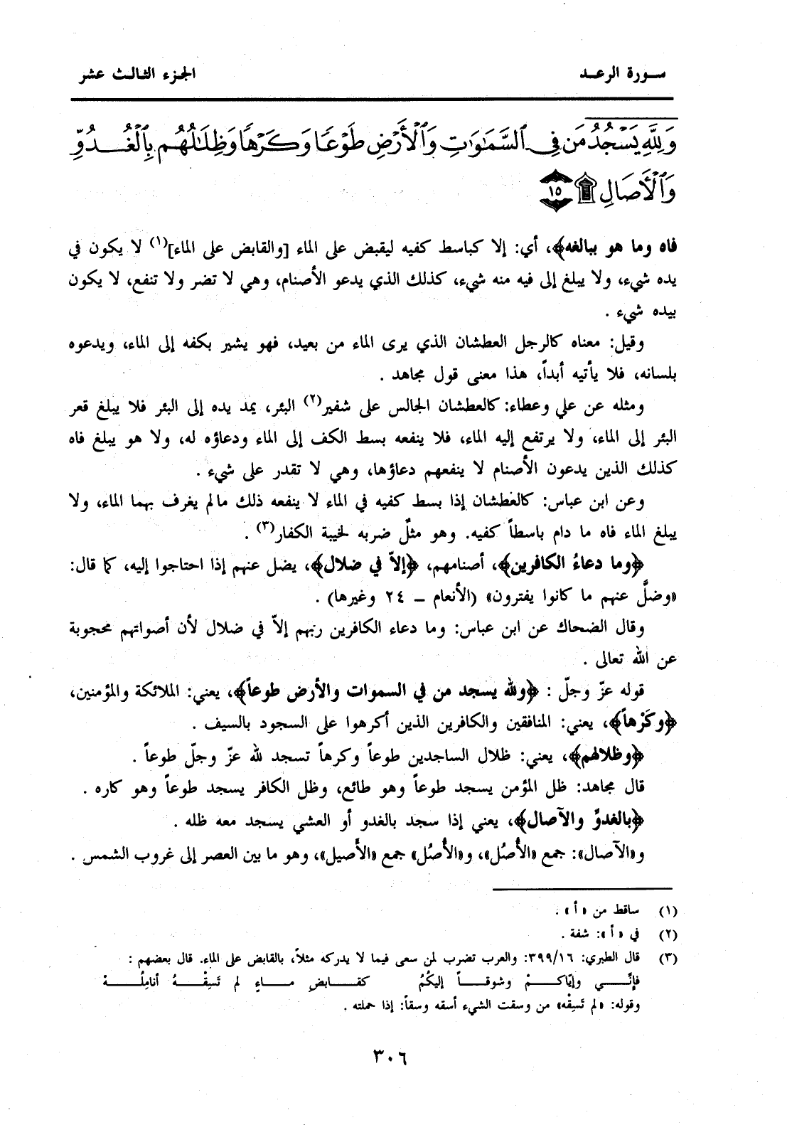 {بِالْغُدُوِّ وَالْآصَالِ} يَعْنِي إِذَا سَجَدَ بِالْغُدُوِّ أَوِ الْعَشِيِّ يَسْجُدُ مَعَهُ ظِلُّهُ. وَ"الْآصَالُ": جَمَعَ "الْأُصُلِ"، وَ"الْأُصُلُ" جَمْعُ "الْأَصِيلِ"، وَهُوَ مَا بَيْنَ الْعَصْرِ إِلَى غُرُوبِ الشَّمْسِ.