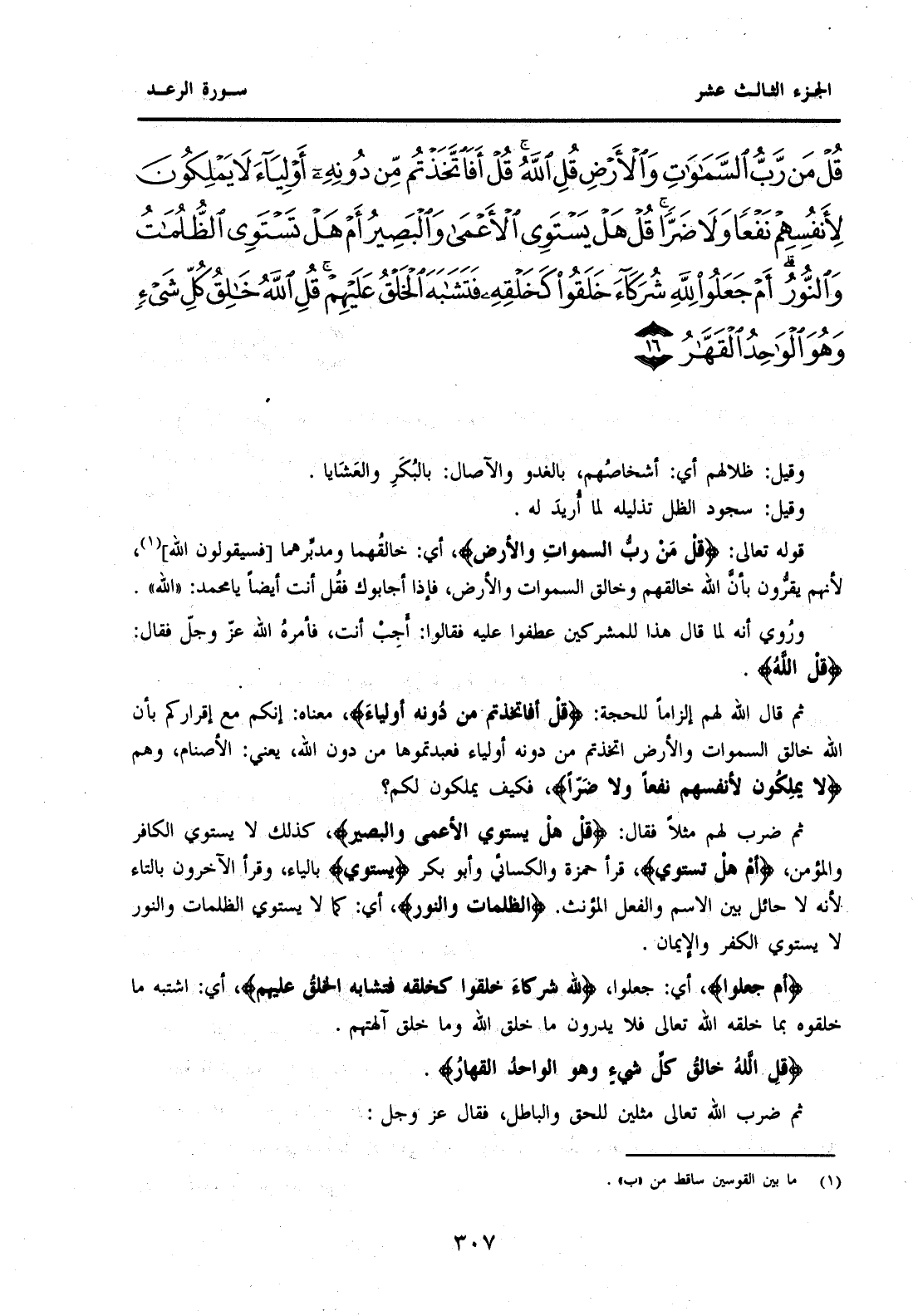 {قُلْ مَنْ رَبُّ السَّمَوَاتِ وَالْأَرْضِ قُلِ اللَّهُ قُلْ أَفَاتَّخَذْتُمْ مِنْ دُونِهِ أَوْلِيَاءَ لَا يَمْلِكُونَ لِأَنْفُسِهِمْ نَفْعًا وَلَا ضَرًّا قُلْ هَلْ يَسْتَوِي الْأَعْمَى وَالْبَصِيرُ أَمْ هَلْ تَسْتَوِي الظُّلُمَاتُ وَالنُّورُ أَمْ جَعَلُوا لِلَّهِ شُرَكَاءَ خَلَقُوا كَخَلْقِهِ فَتَشَابَهَ الْخَلْقُ عَلَيْهِمْ قُلِ اللَّهُ خَالِقُ كُلِّ شَيْءٍ وَهُوَ الْوَاحِدُ الْقَهَّارُ (16) } .