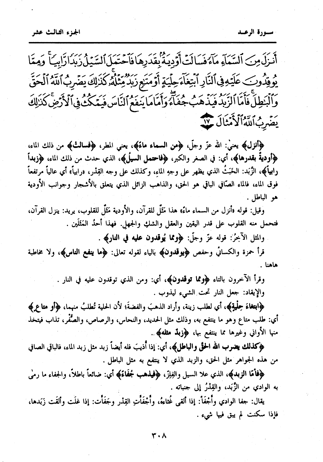 {أَنْزَلَ} يَعْنِي: اللَّهَ عَزَّ وَجَلَّ، {مِنَ السَّمَاءِ مَاءً} يَعْنِي: الْمَطَرَ، {فَسَالَتْ} مِنْ ذَلِكَ الْمَاءِ، {أَوْدِيَةٌ بِقَدَرِهَا} أَيْ: فِي الصِّغَرِ وَالْكِبَرِ، {فَاحْتَمَلَ السَّيْلُ} الَّذِي حَدَثَ مِنْ ذَلِكَ الْمَاءِ، {زَبَدًا رَابِيًا} الزَّبَدُ: الْخَبَثُ الَّذِي يَظْهَرُ عَلَى وَجْهِ الْمَاءِ، وَكَذَلِكَ عَلَى وَجْهِ الْقِدْرِ، "رَابِيًا" أَيْ عَالِيًا مُرْتَفِعًا فَوْقَ الْمَاءِ، فَالْمَاءُ الصَّافِي الْبَاقِي هُوَ الْحَقُّ، وَالذَّاهِبُ الزَّائِلُ الَّذِي يَتَعَلَّقُ بِالْأَشْجَارِ وَجَوَانِبِ الْأَوْدِيَةِ هُوَ الْبَاطِلُ.