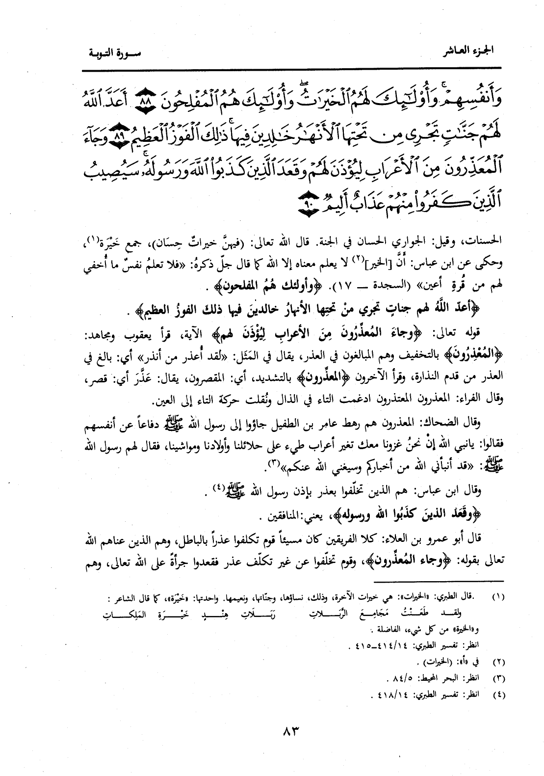 قَوْلُهُ تَعَالَى: {وَجَاءَ الْمُعَذِّرُونَ مِنَ الْأَعْرَابِ لِيُؤْذَنَ لَهُمْ} الْآيَةُ، قَرَأَ يَعْقُوبُ وَمُجَاهِدٌ: {َ الْمُعْذِرُونَ} بِالتَّخْفِيفِ وَهُمُ الْمُبَالِغُونَ فِي الْعُذْرِ، يُقَالُ فِي الْمَثَلِ: "لَقَدْ أَعْذَرَ مَنْ أَنْذَرَ" أَيْ: بَالَغَ فِي الْعُذْرِ مَنْ قَدَّمَ النِّذَارَةَ، وَقَرَأَ الْآخَرُونَ " الْمُعَذِّرُونَ " بِالتَّشْدِيدِ أَيِ: الْمُقَصِّرُونَ، يُقَالُ: عَذَّرَ أَيْ: قَصَّرَ، وَقَالَ الْفَرَّاءُ: الْمُعَذِّرُونَ الْمُعْتَذِرُونَ أُدْغِمَتِ التَّاءُ فِي الذَّالِ وَنُقِلَتْ حَرَكَةُ التَّاءِ إِلَى الْعَيْنِ.
