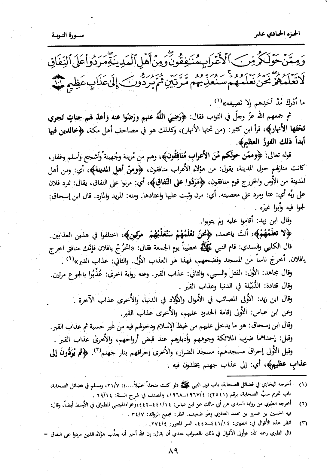 (3) انظر هذه الأقوال في: الطبري: 14 / 441-445، الدر المنثور: 4 / 274. قال الطبري رحمه الله: "وأولى الأقوال في ذلك بالصواب عندي أن يقال: إن الله أخبر أنه يعذِّب هؤلاء الذين مردوا على النفاق مرتين ولم يضع لنا دليلا يوصل به إلى علم صفة ذينك العذابين - وجائز أن يكون بعض ما ذكرنا عن القائلين ما أنبئنا عنهم. وليس عندنا علم بأيِّ ذلك من أيّ. غير أن في قوله جل ثناؤه: "ثم يردون إلى عذاب عظيم"، دلالة على أن العذاب في المرتين كلتيهما قبل دخولهم النار. والأغلب من إحدى المرتين أنها في القبر".