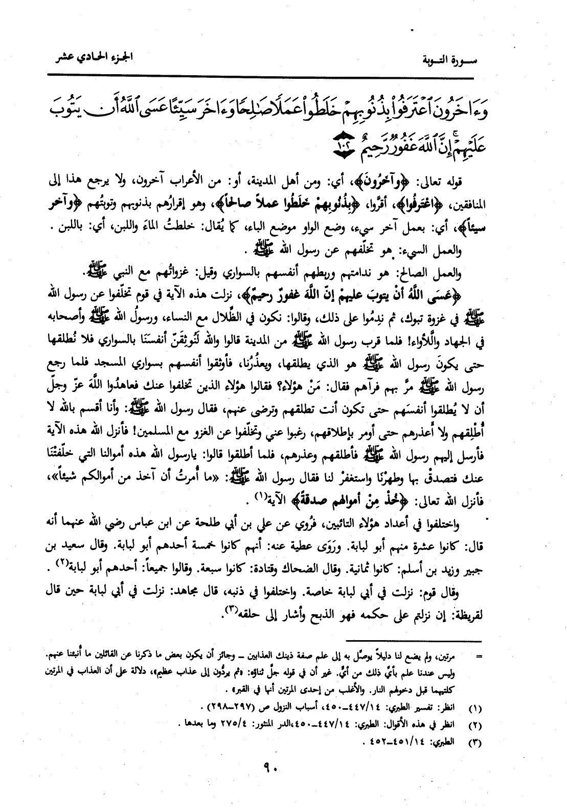 {عَسَى اللَّهُ أَنْ يَتُوبَ عَلَيْهِمْ إِنَّ اللَّهَ غَفُورٌ رَحِيمٌ} نَزَلَتْ هَذِهِ الْآيَةُ فِي قَوْمٍ تَخَلَّفُوا عَنْ رَسُولِ اللَّهِ صَلَّى اللَّهُ عَلَيْهِ وَسَلَّمَ فِي غَزْوَةِ تَبُوكَ، ثُمَّ نَدِمُوا عَلَى ذَلِكَ، وَقَالُوا: نَكُونُ فِي الظِّلَالِ مَعَ النِّسَاءِ، وَرَسُولُ اللَّهِ صَلَّى اللَّهُ عَلَيْهِ وَسَلَّمَ وَأَصْحَابُهُ فِي الْجِهَادِ وَاللَّأْوَاءِ! فَلَمَّا قَرُبَ رَسُولُ اللَّهِ صَلَّى اللَّهُ عَلَيْهِ وَسَلَّمَ مِنَ الْمَدِينَةِ قَالُوا وَاللَّهِ لَنُوثِقَنَّ أَنْفُسَنَا بِالسَّوَارِي فَلَا نُطْلِقُهَا حَتَّى يَكُونَ رَسُولُ اللَّهِ صَلَّى اللَّهُ عَلَيْهِ وَسَلَّمَ هُوَ الَّذِي يُطْلِقُهَا، وَيَعْذُرُنَا، فَأَوْثَقُوا أَنْفُسَهُمْ بِسَوَارِي الْمَسْجِدِ فَلَمَّا رَجَعَ رَسُولُ اللَّهِ صَلَّى اللَّهُ عَلَيْهِ وَسَلَّمَ مَرَّ بِهِمْ فَرَآهُمْ فَقَالَ: مَنْ هَؤُلَاءِ؟ فَقَالُوا: هَؤُلَاءِ الَّذِينَ تَخَلَّفُوا عَنْكَ فَعَاهَدُوا اللَّهَ عَزَّ وَجَلَّ أَنْ لَا يُطْلِقُوا أَنْفُسَهُمْ حَتَّى تَكُونَ أَنْتَ تُطْلِقُهُمْ وَتَرْضَى عَنْهُمْ، فَقَالَ رَسُولُ اللَّهِ صَلَّى اللَّهُ عَلَيْهِ وَسَلَّمَ: وَأَنَا أُقْسِمُ بِاللَّهِ لَا أُطْلِقُهُمْ وَلَا أَعْذُرُهُمْ حَتَّى أُومَرَ بِإِطْلَاقِهِمْ، رَغِبُوا عَنِّي وَتَخَلَّفُوا عَنِ الْغَزْوِ مَعَ الْمُسْلِمِينَ! فَأَنْزِلُ اللَّهُ هَذِهِ الْآيَةَ فَأَرْسَلَ إِلَيْهِمْ رَسُولُ اللَّهِ صَلَّى اللَّهُ عَلَيْهِ وَسَلَّمَ فَأَطْلَقَهُمْ وَعَذَرَهُمْ، فَلَمَّا أُطْلِقُوا قَالُوا: يَا رَسُولَ اللَّهِ هَذِهِ أَمْوَالُنَا الَّتِي خَلَّفَتْنَا عَنْكَ فَتَصَدَّقْ بِهَا وَطَهِّرْنَا وَاسْتَغْفِرْ لَنَا فَقَالَ رَسُولُ اللَّهِ صَلَّى اللَّهُ عَلَيْهِ وَسَلَّمَ: "مَا أُمِرْتُ أَنْ آخُذَ مِنْ أَمْوَالِكُمْ شَيْئًا"، فَأَنْزَلَ اللَّهُ تَعَالَى: {خُذْ مِنْ أَمْوَالِهِمْ صَدَقَةً} الْآيَةَ (1) .