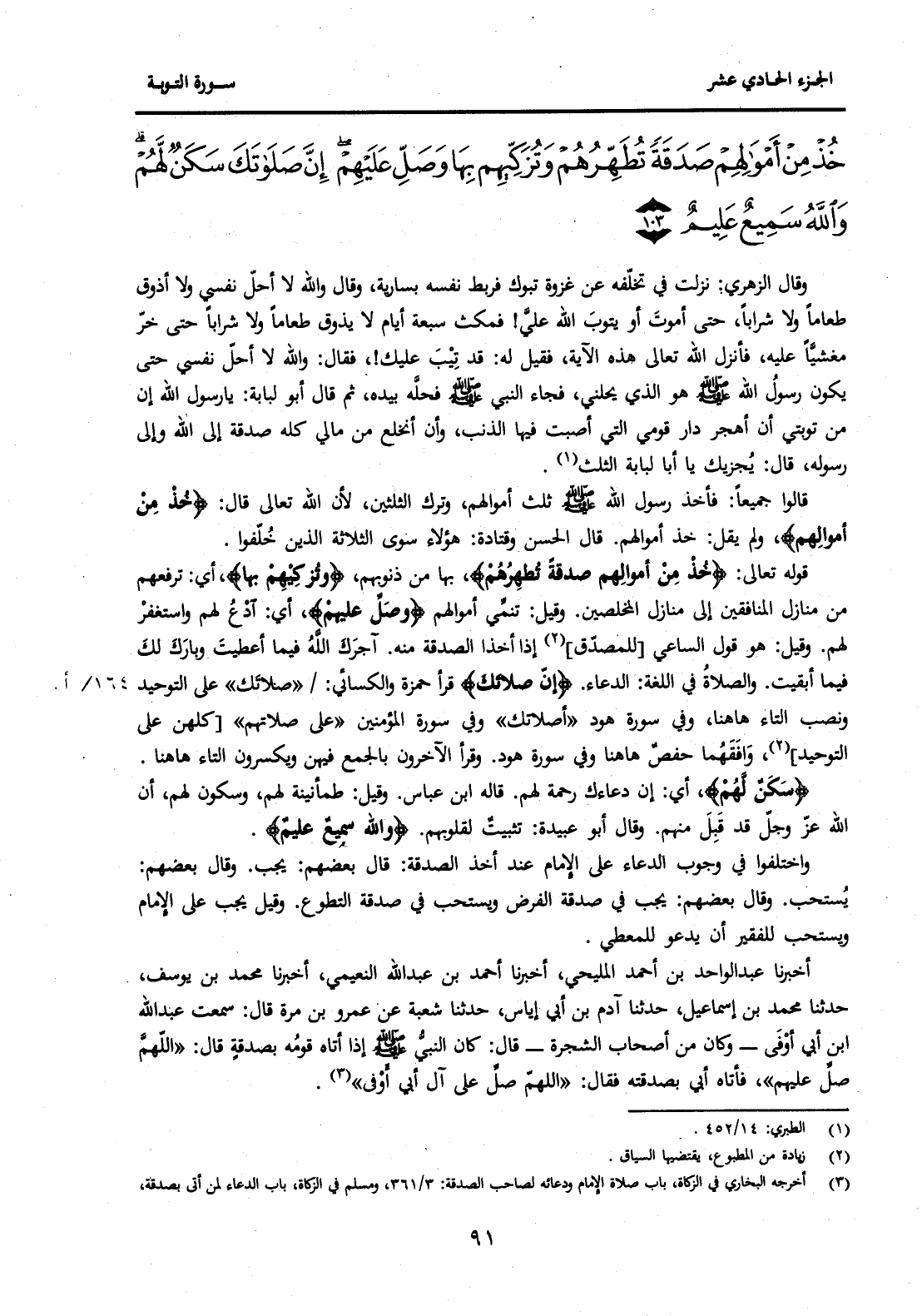 {خُذْ مِنْ أَمْوَالِهِمْ صَدَقَةً تُطَهِّرُهُمْ وَتُزَكِّيهِمْ بِهَا وَصَلِّ عَلَيْهِمْ إِنَّ صَلَاتَكَ سَكَنٌ لَهُمْ وَاللَّهُ سَمِيعٌ عَلِيمٌ (103) } .