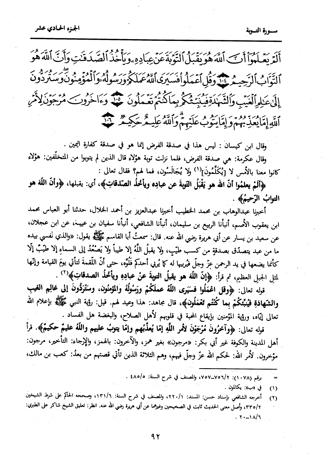 (2) أخرجه الشافعي بإسناد حسن: المسند: 1 / 220، والمصنف في شرح السنة: 6 / 131، وصححه الحاكم على شرط الشيخين 2 / 335، وأصل معنى الحديث ثابت في الصحيحين وغيرهما عن أبي هريرة رضي الله عنه. انظر: تعليق الشيخ شاكر على الطبري: 6 / 18-20.