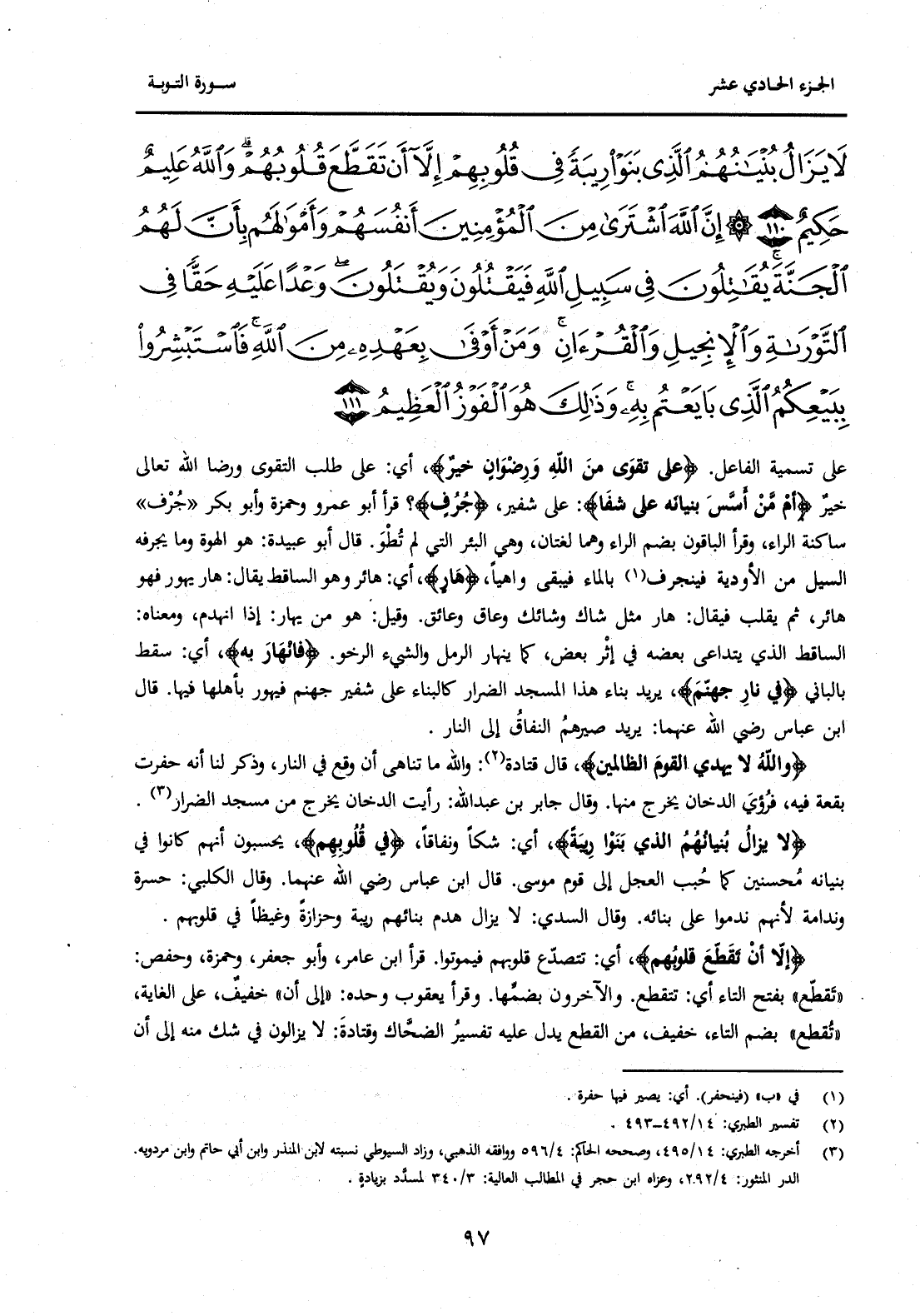{لَا يَزَالُ بُنْيَانُهُمُ الَّذِي بَنَوْا رِيبَةً فِي قُلُوبِهِمْ إِلَّا أَنْ تَقَطَّعَ قُلُوبُهُمْ وَاللَّهُ عَلِيمٌ حَكِيمٌ (110) إِنَّ اللَّهَ اشْتَرَى مِنَ الْمُؤْمِنِينَ أَنْفُسَهُمْ وَأَمْوَالَهُمْ بِأَنَّ لَهُمُ الْجَنَّةَ يُقَاتِلُونَ فِي سَبِيلِ اللَّهِ فَيَقْتُلُونَ وَيُقْتَلُونَ وَعْدًا عَلَيْهِ حَقًّا فِي التَّوْرَاةِ وَالْإِنْجِيلِ وَالْقُرْآنِ وَمَنْ أَوْفَى بِعَهْدِهِ مِنَ اللَّهِ فَاسْتَبْشِرُوا بِبَيْعِكُمُ الَّذِي بَايَعْتُمْ بِهِ وَذَلِكَ هُوَ الْفَوْزُ الْعَظِيمُ (111) } .