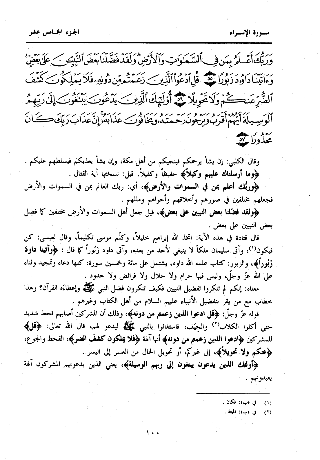 {وَرَبُّكَ أَعْلَمُ بِمَنْ فِي السَّمَاوَاتِ وَالْأَرْضِ وَلَقَدْ فَضَّلْنَا بَعْضَ النَّبِيِّينَ عَلَى بَعْضٍ وَآتَيْنَا دَاوُدَ زَبُورًا (55) قُلِ ادْعُوا الَّذِينَ زَعَمْتُمْ مِنْ دُونِهِ فَلَا يَمْلِكُونَ كَشْفَ الضُّرِّ عَنْكُمْ وَلَا تَحْوِيلًا (56) أُولَئِكَ الَّذِينَ يَدْعُونَ يَبْتَغُونَ إِلَى رَبِّهِمُ الْوَسِيلَةَ أَيُّهُمْ أَقْرَبُ وَيَرْجُونَ رَحْمَتَهُ وَيَخَافُونَ عَذَابَهُ إِنَّ عَذَابَ رَبِّكَ كَانَ مَحْذُورًا (57) }