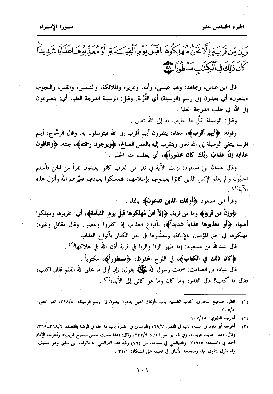 (1) انظر: صحيح البخاري كتاب التفسير باب "أولئك الذين يدعون يبتغون إلى ربهم الوسيلة": 8 / 398، الدر المنثور: 5 / 305.