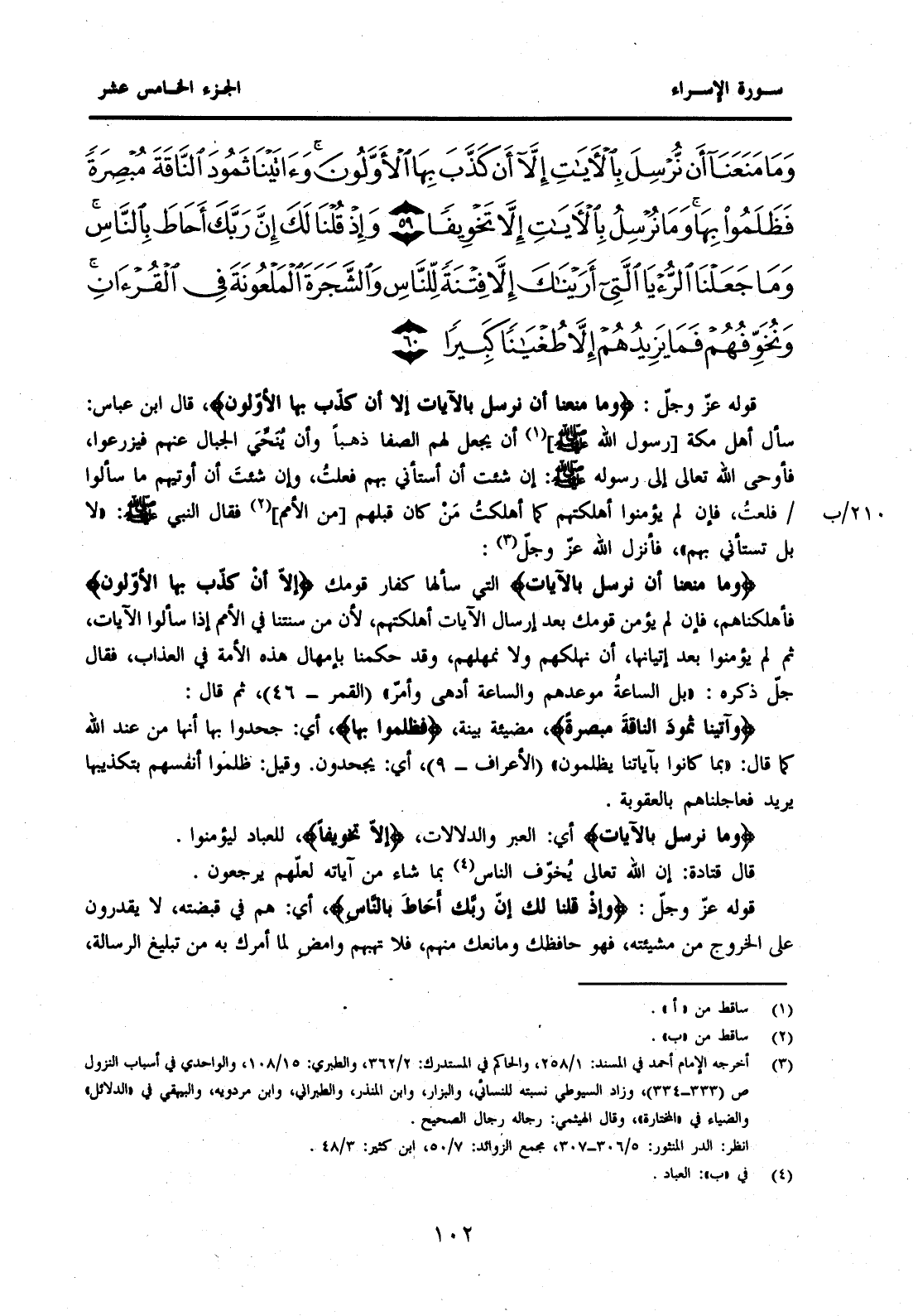 {وَمَا مَنَعَنَا أَنْ نُرْسِلَ بِالْآيَاتِ إِلَّا أَنْ كَذَّبَ بِهَا الْأَوَّلُونَ وَآتَيْنَا ثَمُودَ النَّاقَةَ مُبْصِرَةً فَظَلَمُوا بِهَا وَمَا نُرْسِلُ بِالْآيَاتِ إِلَّا تَخْوِيفًا (59) وَإِذْ قُلْنَا لَكَ إِنَّ رَبَّكَ أَحَاطَ بِالنَّاسِ وَمَا جَعَلْنَا الرُّؤْيَا الَّتِي أَرَيْنَاكَ إِلَّا فِتْنَةً لِلنَّاسِ وَالشَّجَرَةَ الْمَلْعُونَةَ فِي الْقُرْآنِ وَنُخَوِّفُهُمْ فَمَا يَزِيدُهُمْ إِلَّا طُغْيَانًا كَبِيرًا (60) }