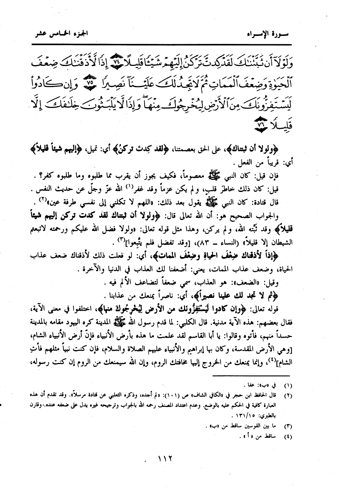 وَالْجَوَابُ الصَّحِيحُ هُوَ أَنَّ اللَّهَ تَعَالَى قَالَ: {وَلَوْلَا أَنْ ثَبَّتْنَاكَ لَقَدْ كِدْتَ تَرْكَنُ إِلَيْهِمْ شَيْئًا قَلِيلًا} وَقَدْ ثَبَّتَهُ اللَّهُ وَلَمْ يَرْكَنْ وَهَذَا مِثْلُ قَوْلِهِ تَعَالَى: "وَلَوْلَا فَضْلُ اللَّهِ عَلَيْكُمْ وَرَحْمَتُهُ لَاتَّبَعْتُمُ الشَّيْطَانَ إِلَّا قَلِيلًا" (النِّسَاءِ-83) [وَقَدْ تَفَضَّلَ فَلَمْ يَتَّبِعُوا] (3) . {إِذًا لَأَذَقْنَاكَ ضِعْفَ الْحَيَاةِ وَضِعْفَ الْمَمَاتِ} أَيْ: لَوْ فَعَلْتَ ذَلِكَ لَأَذَقْنَاكَ ضِعْفَ عَذَابِ الْحَيَاةِ وَضَعْفَ عَذَابِ الْمَمَاتِ يَعْنِي: أَضْعَفْنَا لَكَ الْعَذَابَ فِي الدُّنْيَا وَالْآخِرَةِ.