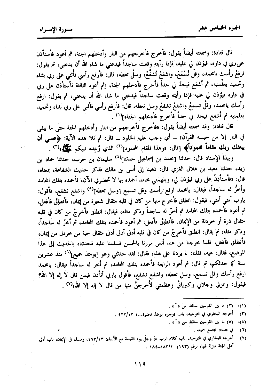 قَالَ قَتَادَةُ: وَقَدْ سَمِعْتُهُ أَيْضًا يَقُولُ: "فَأَخْرُجُ فَأُخْرِجُهُمْ مِنَ النَّارِ وَأُدْخِلُهُمُ الْجَنَّةَ حَتَّى مَا يَبْقَى فِي النَّارِ إِلَّا مَنْ حَبَسَهُ الْقُرْآنُ" -أَيْ وَجَبَ عَلَيْهِ الْخُلُودُ-قَالَ: ثُمَّ تَلَا هَذِهِ الْآيَةَ: {عَسَى أَنْ يَبْعَثَكَ رَبُّكَ مَقَامًا مَحْمُودًا} [قَالَ: "وَهَذَا الْمَقَامُ الْمَحْمُودُ] (2) الَّذِي وُعِدَهُ نَبِيُّكُمْ صَلَّى اللَّهُ عَلَيْهِ وَسَلَّمَ" (3) .