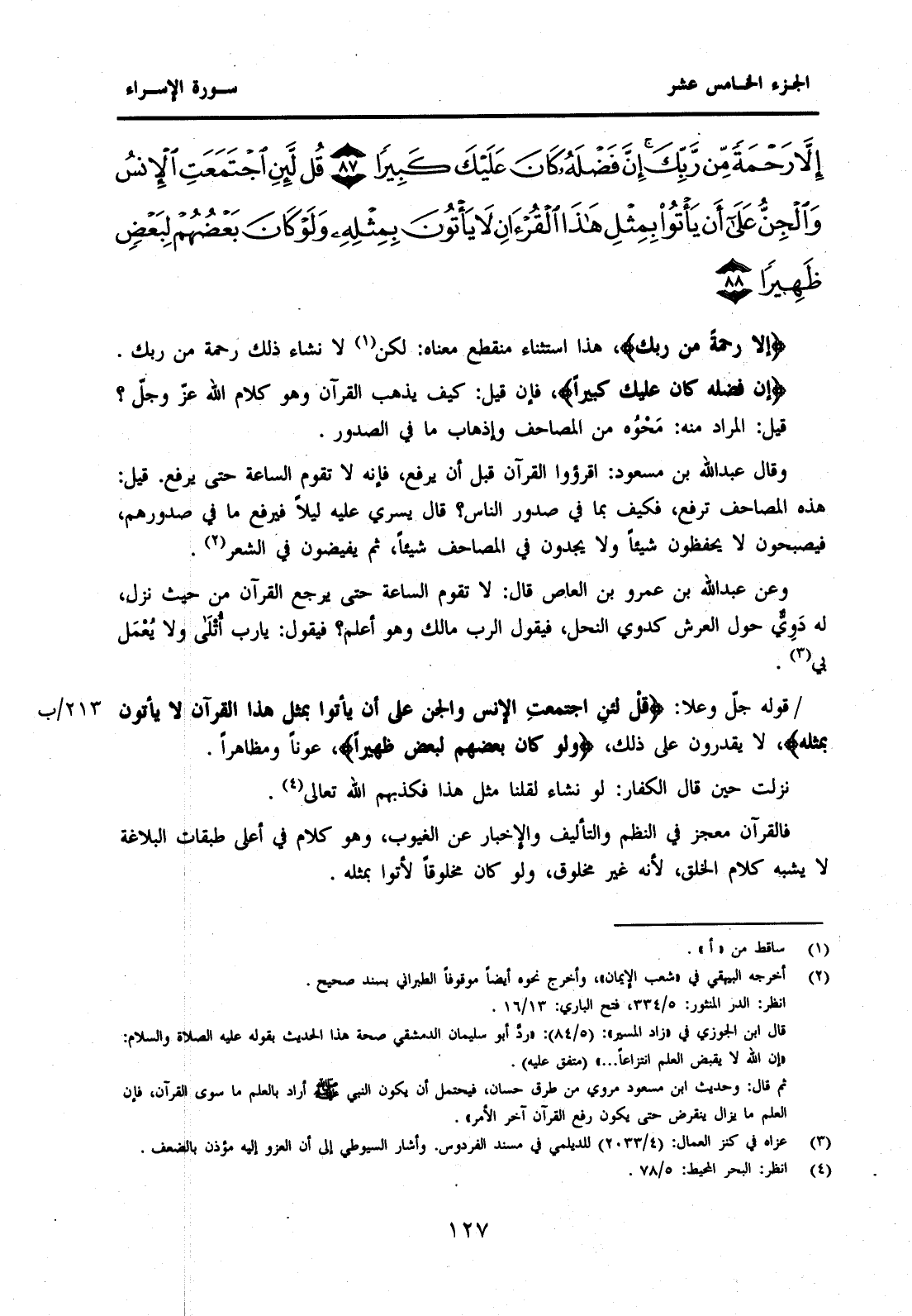 {إِلَّا رَحْمَةً مِنْ رَبِّكَ إِنَّ فَضْلَهُ كَانَ عَلَيْكَ كَبِيرًا (87) قُلْ لَئِنِ اجْتَمَعَتِ الْإِنْسُ وَالْجِنُّ عَلَى أَنْ يَأْتُوا بِمِثْلِ هَذَا الْقُرْآنِ لَا يَأْتُونَ بِمِثْلِهِ وَلَوْ كَانَ بَعْضُهُمْ لِبَعْضٍ ظَهِيرًا (88) }