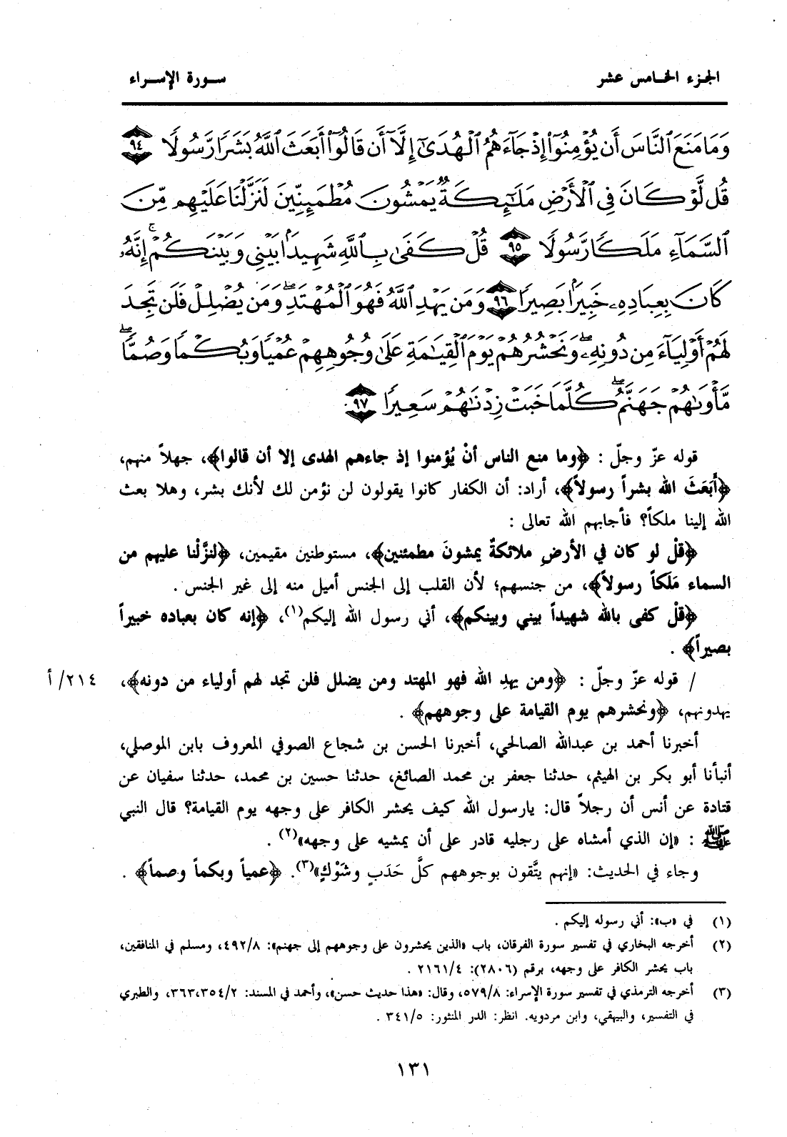 قَوْلُهُ عَزَّ وَجَلَّ: {وَمَا مَنَعَ النَّاسَ أَنْ يُؤْمِنُوا إِذْ جَاءَهُمُ الْهُدَى إِلَّا أَنْ قَالُوا} جَهْلًا مِنْهُمْ {أَبَعَثَ اللَّهُ بَشَرًا رَسُولًا} أَرَادَ: أَنَّ الْكُفَّارَ كَانُوا يَقُولُونَ لَنْ نُؤْمِنَ لَكَ لِأَنَّكَ بَشَرٌ وَهَلَّا بَعَثَ اللَّهُ إِلَيْنَا مَلَكًا؟ فَأَجَابَهُمُ اللَّهُ تَعَالَى: {قُلْ لَوْ كَانَ فِي الْأَرْضِ مَلَائِكَةٌ يَمْشُونَ مُطْمَئِنِّينَ} {قُلْ لَوْ كَانَ فِي الْأَرْضِ مَلَائِكَةٌ يَمْشُونَ مُطْمَئِنِّينَ} مُسْتَوْطِنِينَ مُقِيمِينَ {لَنَزَّلْنَا عَلَيْهِمْ مِنَ السَّمَاءِ مَلَكًا رَسُولًا} مِنْ جِنْسِهِمْ لِأَنَّ الْقَلْبَ إِلَى الْجِنْسِ أَمْيَلُ مِنْهُ إِلَى غَيْرِ الْجِنْسِ. {قُلْ كَفَى بِاللَّهِ شَهِيدًا بَيْنِي وَبَيْنَكُمْ} أَنِّي رَسُولُ اللَّهِ إِلَيْكُمْ (1) {إِنَّهُ كَانَ بِعِبَادِهِ خَبِيرًا بَصِيرًا} 214/أقَوْلُهُ عَزَّ وَجَلَّ: {وَمَنْ يَهْدِ اللَّهُ فَهُوَ الْمُهْتَدِي وَمَنْ يُضْلِلْ فَلَنْ تَجِدَ لَهُمْ أَوْلِيَاءَ مِنْ دُونِهِ} يَهْدُونَهُمْ {وَنَحْشُرُهُمْ يَوْمَ الْقِيَامَةِ عَلَى وُجُوهِهِمْ}