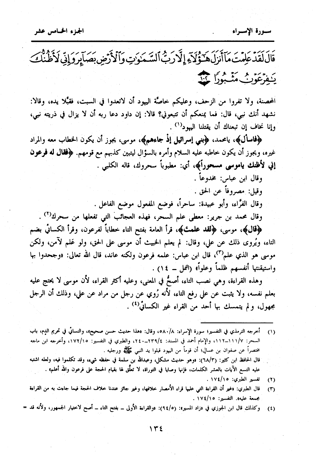 (4) وكذلك قال ابن الجوزي في "زاد المسير": (5 / 94) : "والقراءة الأولى -بفتح التاء- أصح لاختيار الجمهور ولأنه قد أبان موسى من المعجزات ما أوجب علم فرعون بصدقه فلم يرد إلا بالتعلل والمدافعة فكأنه قال: لقد علمت بالدليل والحجة "ما أنزل هؤلاء" يعني الآيات".