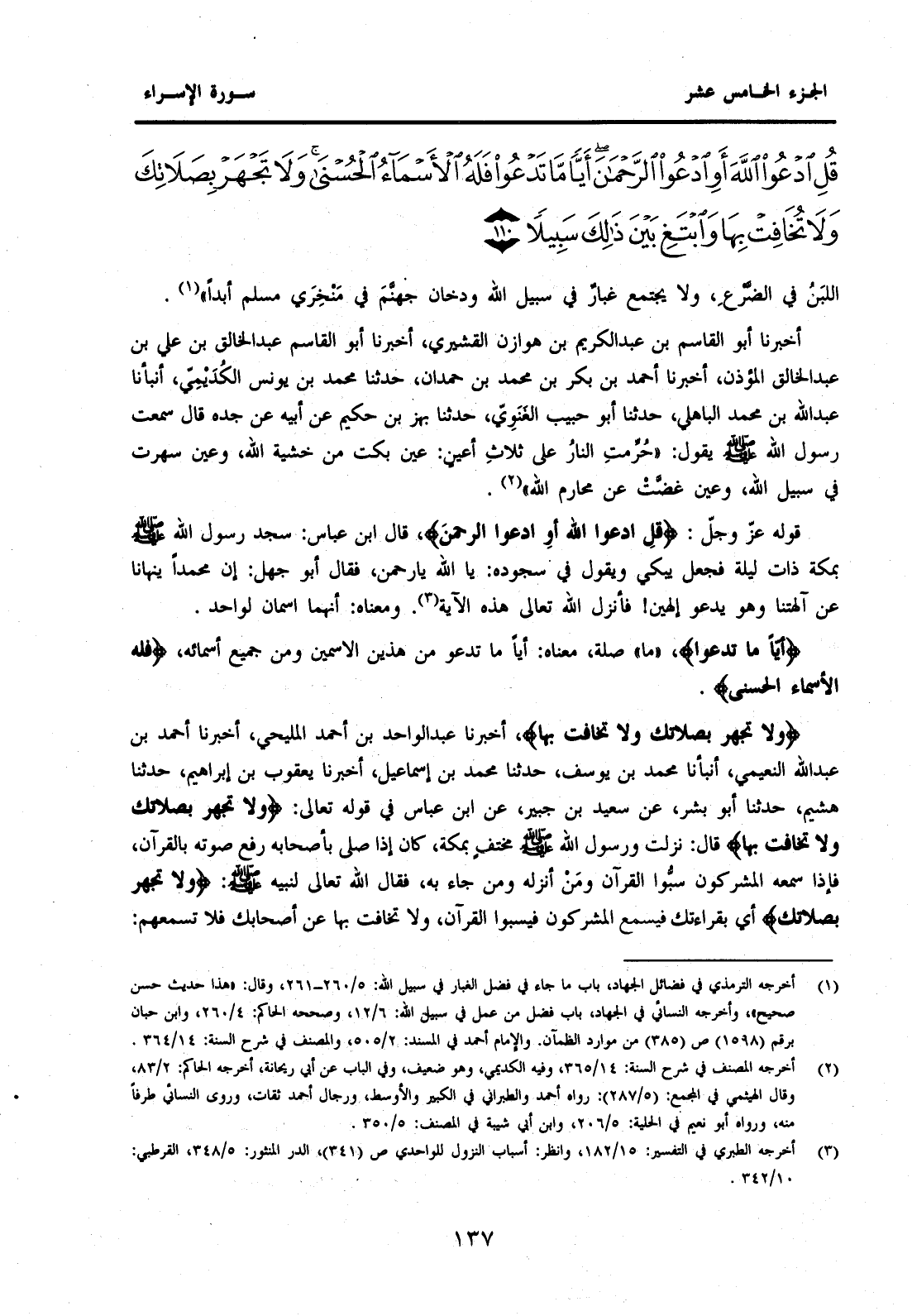 {وَلَا تَجْهَرْ بِصَلَاتِكَ وَلَا تُخَافِتْ بِهَا} أَخْبَرَنَا عَبْدُ الْوَاحِدِ بْنُ أَحْمَدَ الْمَلِيحِيُّ أَخْبَرَنَا أَحْمَدُ بْنُ عَبْدِ اللَّهِ النَّعِيمِيُّ أَنْبَأَنَا مُحَمَّدُ بْنُ يُوسُفَ حَدَّثَنَا مُحَمَّدُ بْنُ إِسْمَاعِيلَ أَخْبَرَنَا يَعْقُوبُ بْنُ إِبْرَاهِيمَ حَدَّثَنَا هُشَيْمٌ حَدَّثَنَا أَبُو بِشْرٍ عَنْ سَعِيدِ بْنِ جُبَيْرٍ عَنِ ابْنِ عَبَّاسٍ فِي قَوْلِهِ تَعَالَى: {وَلَا تَجْهَرْ بِصَلَاتِكَ وَلَا تُخَافِتْ بِهَا} قَالَ: نَزَلَتْ وَرَسُولُ اللَّهِ صَلَّى اللَّهُ عَلَيْهِ وَسَلَّمَ مُخْتَفٍ بِمَكَّةَ كَانَ إِذَا صَلَّى بِأَصْحَابِهِ رَفَعَ صَوْتَهُ بِالْقُرْآنِ فَإِذَا سَمِعَهُ الْمُشْرِكُونَ سَبُّوا الْقُرْآنَ وَمَنْ أَنْزَلَهُ وَمَنْ جَاءَ بِهِ فَقَالَ اللَّهُ تَعَالَى لِنَبِيِّهِ صَلَّى اللَّهُ عَلَيْهِ وَسَلَّمَ: {وَلَا تَجْهَرْ بِصَلَاتِكَ} أَيْ بِقِرَاءَتِكَ فَيَسْمَعَ الْمُشْرِكُونَ فَيَسُبُّوا الْقُرْآنَ وَلَا تُخَافِتْ بِهَا عَنْ أَصْحَابِكَ فَلَا تُسْمِعَهُمْ: