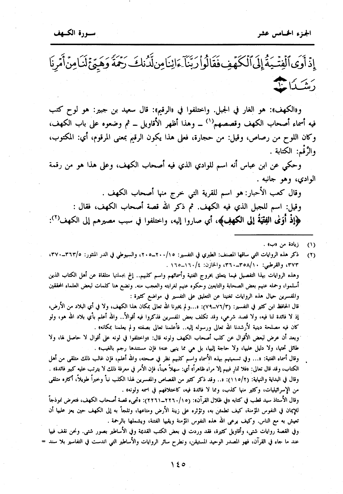 (2) ذكر هذه الروايات التي ساقها المصنف: الطبري في التفسير: 15/200-205، والسيوطي في الدر المنثور: 5 / 363-370، 373، والقرطبي: 10 / 358-360، والخازن: 4 / 160-165. وهذه الروايات بهذا التفصيل فيما يتعلق بخروج الفتية وأسمائهم واسم كلبهم.. إلخ بجملتها متلقاة عن أهل الكتاب الذين أسلموا وحملهم عنهم بعض الصحابة والتابعين وحكوه عنهم لغرابته والعجب منه ونضع هنا كلمات لبعض العلماء المحققين والمفسرين حيال هذه الروايات تغنينا عن التعليق على التفسير في مواضع كثيرة: قال الحافظ ابن كثير في التفسير: (3 / 76-79) : " ... ولم يخبرنا الله تعالى بمكان هذا الكهف ولا في أي البلاد من الأرض إذ لا فائدة لنا فيه ولا قصد شرعي وقد تكلف بعض المفسرين فذكروا فيه أقوالا.. والله أعلم بأي بلاد الله هو ولو كان فيه مصلحة دينية لأرشدنا الله تعالى ورسوله إليه.. فأعلمنا تعالى بصفته ولم يعلمنا بمكانه". وبعد أن عرض لبعض الأقوال عن كلب أصحاب الكهف ولونه قال: "واختلفوا في لونه على أقوال لا حاصل لها ولا طائل تحتها ولا دليل عليها ولا حاجة إليها بل هي مما ينهى عنه؛ فإن مستندها رجم بالغيب". وقال عن أسماء الفتية: " ... وفي تسميتهم بهذه الأسماء واسم كلبهم نظر في صحته والله أعلم فإن غالب ذلك متلقى من أهل الكتاب وقد قال تعالى: "فلا تمار فيهم إلا مراء ظاهرا" أي: سهلا هينا فإن الأمر في معرفة ذلك لايترتب عليه كبير فائدة". وقال في البداية والنهاية: (2 / 115) : ".. وقد ذكر كثير من القصاص والمفسرين لهذا الكلب نبأ وخبرا طويلا أكثره متلقى من الإسرائيليات وكثير منها كذب ومما لا فائدة فيه كاختلافهم في اسمه ولونه". وقال الأستاذ سيد قطب في كتابه "في ظلال القرآن": (15 / 2260-2261) : "تجيء قصة أصحاب الكهف فتعرض نموذجا للإيمان في النفوس المؤمنة كيف تطمئن به وتؤثره على زينة الأرض ومتاعها وتلجأ به إلى الكهف حين يعز عليها أن تعيش به مع الناس وكيف يرعى الله هذه النفوس المؤمنة ويقيها الفتنة ويشملها بالرحمة. وفي القصة روايات شتى وأقاويل كثيرة فقد وردت في بعض الكتب القديمة وفي الأساطير بصور شتى ونحن نقف فيها عند ما جاء في القرآن فهو المصدر الوحيد المستيقن ونطرح سائر الروايات والأساطير التي اندست في التفاسير بلا سند صحيح وبخاصة أن القرآن الكريم قد نهى عن استفتاء غير القرآن فيها وعن المراء فيها والجدل رجما بالغيب". وقال الشيخ محمد الأمين الشنقيطي في "أضواء البيان": (4 / 20) : "واعلم أن قصة أصحاب الكهف وأسمائهم وفي أي محل من الأرض كانوا كل ذلك لم يثبت فيه عن النبي صَلَّى اللَّهُ عَلَيْهِ وَسَلَّمَ شيء زائد على ما في القرآن وللمفسرين في ذلك أخبار كثيرة إسرائيلية أعرضنا عن ذكرها لعدم الثقة بها". وراجع: الإسرائيليات والموضوعات للشيخ محمد أبو شهبة ص (235-237) .