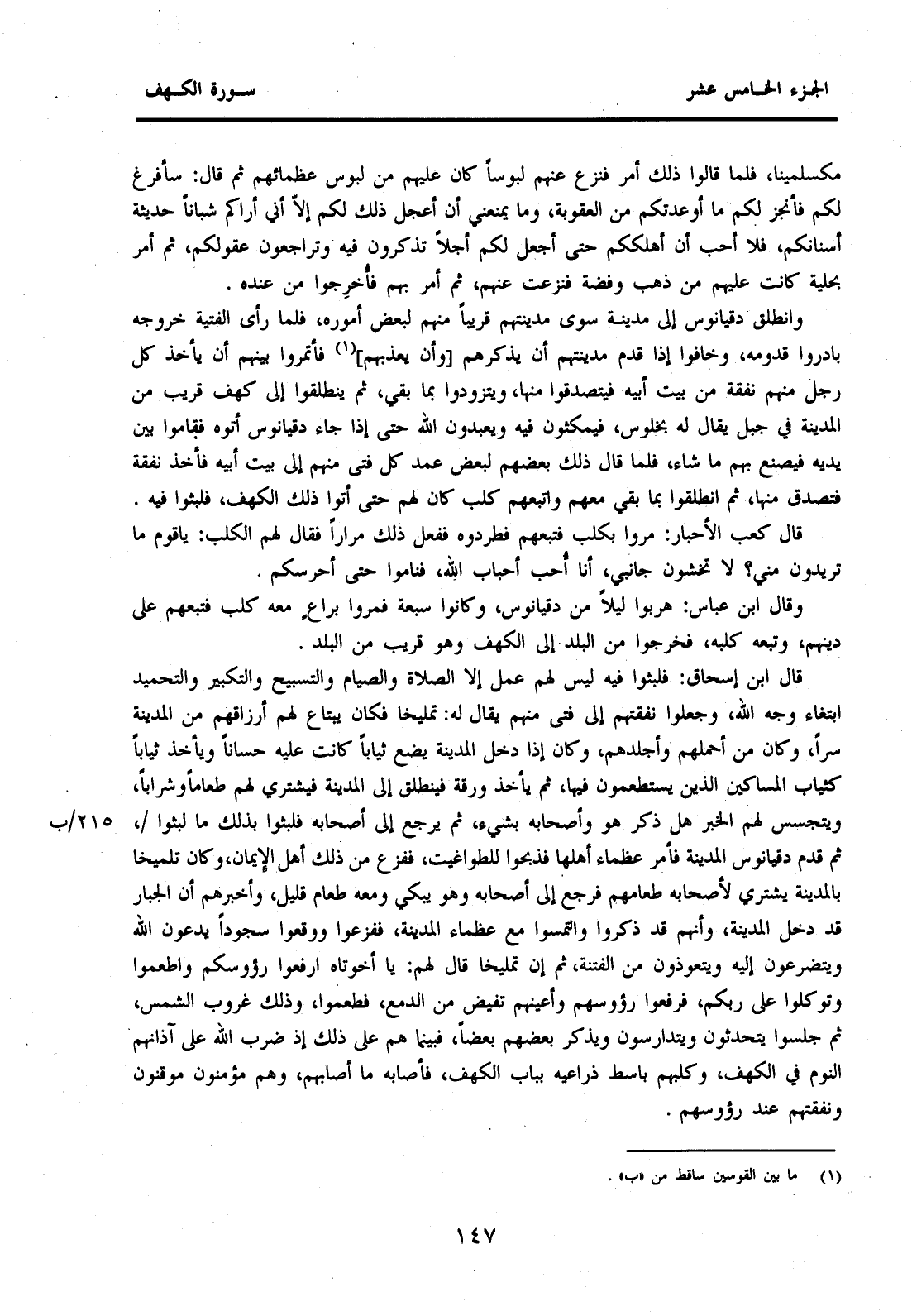 وَقَالَ ابْنُ عَبَّاسٍ: هَرَبُوا لَيْلًا مِنْ دِقْيَانُوسَ وَكَانُوا سَبْعَةً فَمَرُّوا بِرَاعٍ مَعَهُ كَلْبٌ فَتَبِعَهُمْ عَلَى دِينِهِمْ وَتَبِعَهُ كَلْبُهُ فَخَرَجُوا مِنَ الْبَلَدِ إِلَى الْكَهْفِ وَهُوَ قَرِيبٌ مِنَ الْبَلَدِ.