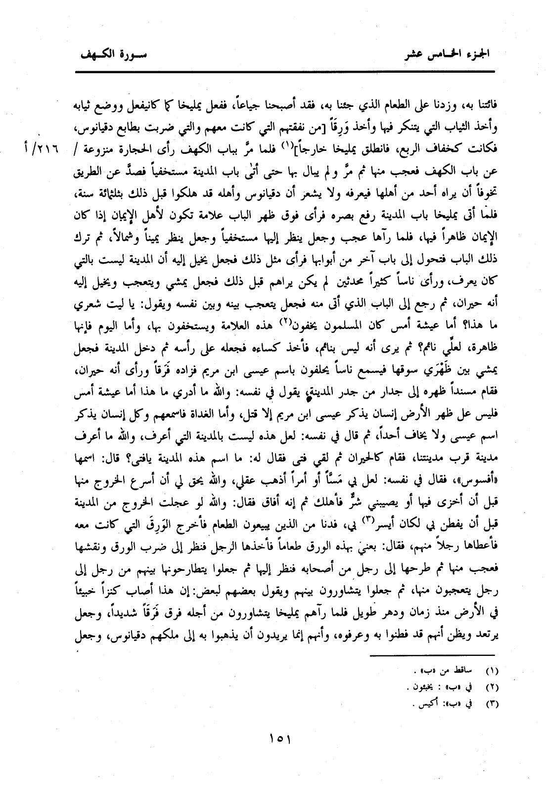 فَائْتِنَا بِهِ وَزِدْنَا عَلَى الطَّعَامِ الَّذِي جِئْنَا بِهِ فَقَدْ أَصْبَحْنَا جِيَاعًا فَفَعَلَ يَمْلِيخَا كَمَا كَانَ يَفْعَلُ وَوَضَعَ ثِيَابَهُ وَأَخَذَ الثِّيَابَ الَّتِي يَتَنَكَّرُ فِيهَا وَأَخَذَ وَرِقًا [مِنْ نَفَقَتِهِمُ الَّتِي كَانَتْ مَعَهُمْ وَالَّتِي ضُرِبَتْ بِطَابَعِ دِقْيَانُوسَ فَكَانَتْ كَخِفَافِ الرُّبُعِ فَانْطَلَقَ يَمْلِيخَا خَارِجًا] (1) فَلَمَّا مَرَّ بِبَابِ الْكَهْفِ رَأَى الحجارة منزوعة 216/أعَنْ بَابِ الْكَهْفِ فَعَجِبَ مِنْهَا ثُمَّ مَرَّ وَلَمْ يُبَالِ بِهَا حَتَّى أَتَى بَابَ الْمَدِينَةِ مُسْتَخْفِيًا فَصَدَّ عَنِ الطَّرِيقِ تَخَوُّفًا أَنْ يَرَاهُ أَحَدٌ مِنْ أَهْلِهَا فَيَعْرِفَهُ وَلَا يَشْعُرُ أَنَّ دِقْيَانُوسَ وَأَهْلَهُ قَدْ هَلَكُوا قبل ذلك بثلثمائة سَنَةٍ فَلَمَّا أَتَى يَمْلِيخَا بَابَ الْمَدِينَةِ رَفَعَ بَصَرَهُ فَرَأَى فَوْقَ ظَهْرِ الْبَابِ عَلَامَةً تَكُونُ لِأَهْلِ الْإِيمَانِ إِذَا كَانَ الْإِيمَانُ ظَاهِرًا فِيهَا فَلَمَّا رَآهَا عَجِبَ وَجَعَلَ يَنْظُرُ إِلَيْهَا مُسْتَخْفِيًا وَجَعَلَ يَنْظُرُ يَمِينًا وَشِمَالًا ثُمَّ تَرَكَ ذَلِكَ الْبَابَ فَتَحَوَّلَ إِلَى بَابٍ آخَرَ مِنْ أَبْوَابِهَا فَرَأَى مِثْلَ ذَلِكَ فَجَعَلَ يُخَيَّلُ إِلَيْهِ أَنَّ الْمَدِينَةَ لَيْسَتْ بِالَّتِي كَانَ يَعْرِفُ وَرَأَى نَاسًا كَثِيرًا مُحْدَثِينَ لَمْ يَكُنْ يَرَاهُمْ قَبْلَ ذَلِكَ فَجَعَلَ يَمْشِي وَيَتَعَجَّبُ وَيُخَيَّلُ إِلَيْهِ أَنَّهُ حَيْرَانُ ثُمَّ رَجَعَ إِلَى الْبَابِ الَّذِي أَتَى مِنْهُ فَجَعَلَ يَتَعَجَّبُ بَيْنَهُ وَبَيْنَ نَفْسِهِ وَيَقُولُ: يَا لَيْتَ شِعْرِي مَا هَذَا؟ أَمَّا عَشِيَّةُ أَمْسٍ كَانَ الْمُسْلِمُونَ يُخْفُونَ (2) هَذِهِ الْعَلَامَةَ وَيَسْتَخْفُونَ بِهَا وَأَمَّا الْيَوْمُ فَإِنَّهَا ظَاهِرَةٌ لَعَلِّي نَائِمٌ؟ ثُمَّ يَرَى أَنَّهُ لَيْسَ بِنَائِمٍ فَأَخَذَ كِسَاءَهُ فَجَعَلَهُ عَلَى رَأْسِهِ ثُمَّ دَخَلَ الْمَدِينَةَ فَجَعَلَ يَمْشِي بَيْنَ ظَهْرَيِ سُوقِهَا فَيَسْمَعُ نَاسًا يَحْلِفُونَ بِاسْمِ عِيسَى ابْنِ مَرْيَمَ فَزَادَهُ فَرَقًا وَرَأَى أَنَّهُ حَيْرَانُ فَقَامَ مُسْنِدًا ظَهْرَهُ إِلَى جِدَارٍ مِنْ جُدُرِ الْمَدِينَةِ يَقُولُ فِي نَفْسِهِ: وَاللَّهِ مَا أَدْرِي مَا هذا أما عيشة أَمْسٍ فَلَيْسَ عَلَى ظَهْرِ الْأَرْضِ إِنْسَانٌ يَذْكُرُ عِيسَى ابْنَ مَرْيَمَ إِلَّا قُتِلَ وَأَمَّا الْغَدَاةُ فَأَسْمَعُهُمْ وَكُلُّ إِنْسَانٍ يَذْكُرُ اسْمَ عِيسَى وَلَا يَخَافُ أَحَدًا ثُمَّ قَالَ فِي نَفْسِهِ: لَعَلَّ هَذِهِ لَيْسَتْ بِالْمَدِينَةِ الَّتِي أَعْرِفُ وَاللَّهِ مَا أَعْرِفُ مَدِينَةً قُرْبَ مَدِينَتِنَا فَقَامَ كَالْحَيْرَانِ ثُمَّ لَقِيَ فَتًى فَقَالَ لَهُ: مَا اسْمُ هَذِهِ الْمَدِينَةِ يَا فَتَى؟ قَالَ اسْمُهَا "أَفَسُوسُ" فَقَالَ فِي نَفْسِهِ: لَعَلَّ بِي مَسًّا أَوْ أَمْرًا أَذْهَبَ عَقْلِي وَاللَّهِ يَحِقُّ لِي أَنْ أُسْرِعَ الْخُرُوجَ مِنْهَا قَبْلَ أَنْ أَخْزَى فِيهَا أَوْ يُصِيبَنِي شَرٌّ فَأَهْلَكُ ثُمَّ إِنَّهُ أَفَاقَ فَقَالَ: وَاللَّهِ لَوْ عَجَّلْتُ الْخُرُوجَ مِنَ الْمَدِينَةِ قَبْلَ أَنْ يُفْطَنَ بِي لَكَانَ أَيْسَرَ (3) بِي.