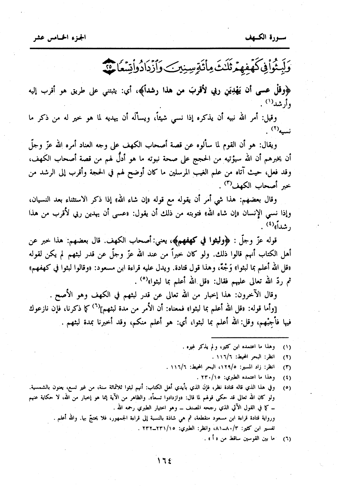 قَوْلُهُ عَزَّ وَجَلَّ {وَلَبِثُوا فِي كَهْفِهِمْ} يَعْنِي: أَصْحَابَ الْكَهْفِ. قَالَ بَعْضُهُمْ: هَذَا خَبَرٌ عَنْ أَهْلِ الْكِتَابِ أَنَّهُمْ قَالُوا ذَلِكَ. وَلَوْ كَانَ خَبَرًا مِنَ اللَّهِ عَزَّ وَجَلَّ عَنْ قَدْرِ لُبْثِهِمْ لَمْ يَكُنْ لِقَوْلِهِ "قُلِ اللَّهُ أَعْلَمُ بِمَا لَبِثُوا" وَجْهٌ وَهَذَا قَوْلُ قَتَادَةَ. وَيَدُلُّ عَلَيْهِ قِرَاءَةُ ابْنِ مَسْعُودٍ: "وَقَالُوا لَبِثُوا فِي كَهْفِهِمْ" ثُمَّ رَدَّ اللَّهُ تَعَالَى عَلَيْهِمْ فَقَالَ: "قُلِ اللَّهُ أَعْلَمُ بِمَا لَبِثُوا" (5) .