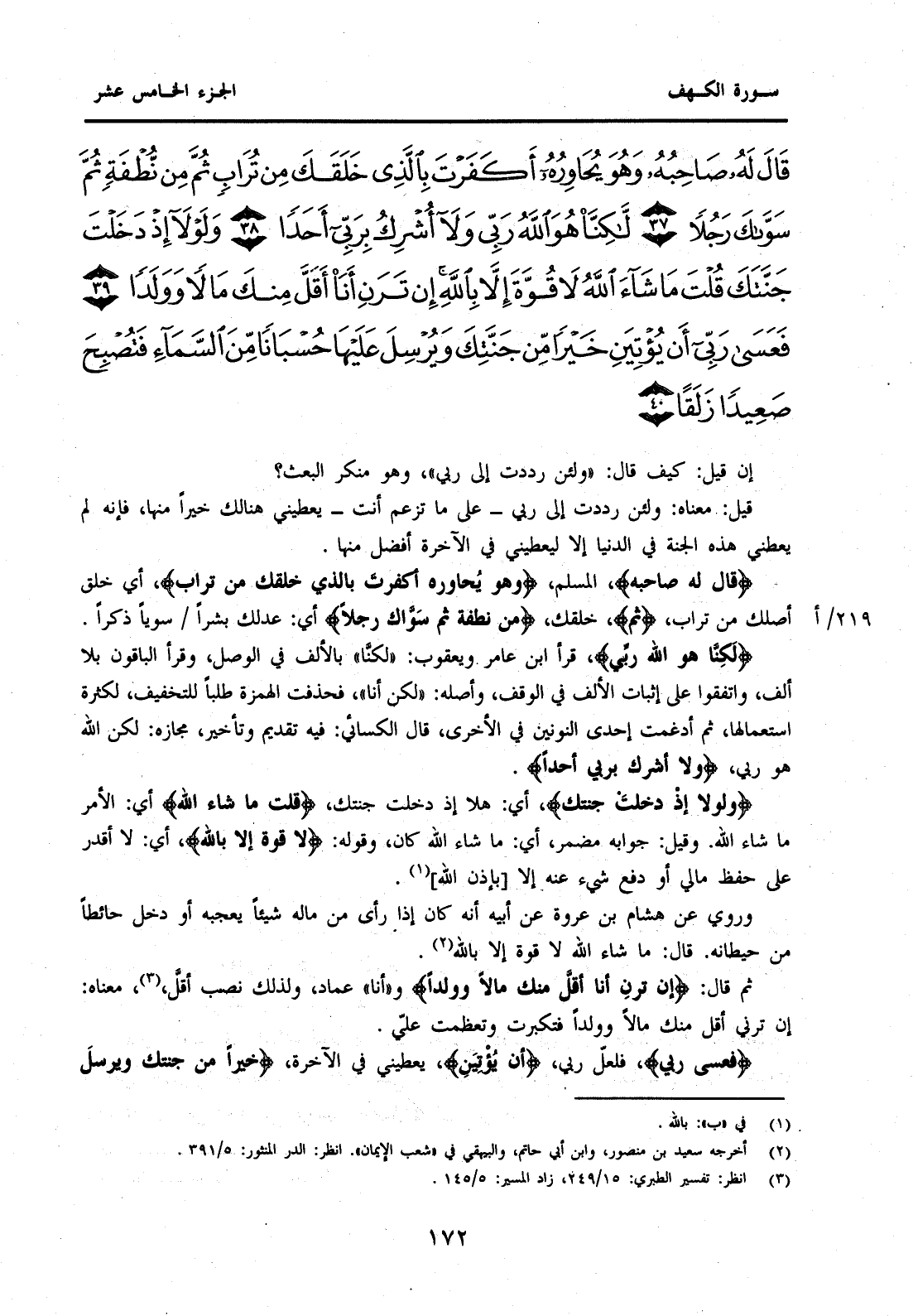 {قَالَ لَهُ صَاحِبُهُ} الْمُسْلِمُ {وَهُوَ يُحَاوِرُهُ أَكَفَرْتَ بِالَّذِي خَلَقَكَ مِنْ تُرَابٍ} أَيْ خَلَقَ أَصْلَكَ مِنْ تُرَابٍ {ثُمَّ} خَلَقَكَ {مِنْ نُطْفَةٍ ثُمَّ سَوَّاكَ رَجُلًا} أَيْ: عدلك بشرا 219/أسَوِيًّا ذَكَرًا. {لَكِنَّا هُوَ اللَّهُ رَبِّي} قَرَأَ ابْنُ عَامِرٍ وَيَعْقُوبُ: "لَكِنَّا" بِالْأَلِفِ فِي الْوَصْلِ وَقَرَأَ الْبَاقُونَ بِلَا أَلِفٍ وَاتَّفَقُوا عَلَى إِثْبَاتِ الْأَلِفِ فِي الْوَقْفِ وَأَصْلُهُ: "لَكِنَّ أَنَا" فَحُذِفَتِ الْهَمْزَةُ طَلَبًا لِلتَّخْفِيفِ لِكَثْرَةِ اسْتِعْمَالِهَا ثُمَّ أُدْغِمَتْ إِحْدَى النُّونَيْنِ فِي الْأُخْرَى قَالَ الْكِسَائِيُّ فِيهِ تَقْدِيمٌ وَتَأْخِيرٌ مَجَازُهُ: لَكِنَّ اللَّهَ هُوَ رَبِّي {وَلَا أُشْرِكُ بِرَبِّي أَحَدًا} {وَلَوْلَا إِذْ دَخَلْتَ جَنَّتَكَ} أَيْ: هَلَّا إِذْ دَخَلْتَ جَنَّتَكَ {قُلْتَ مَا شَاءَ اللَّهُ} أَيِ: الْأَمْرُ مَا شَاءَ اللَّهُ. وَقِيلَ: جَوَابُهُ مُضْمَرٌ أَيْ: مَا شَاءَ اللَّهُ كَانَ، وَقَوْلُهُ: {لَا قُوَّةَ إِلَّا بِاللَّهِ} أَيْ: لَا أَقْدِرُ عَلَى حِفْظِ مَالِي أَوْ دَفْعِ شَيْءٍ عَنْهُ إِلَّا [بِإِذْنِ اللَّهِ] (1) .