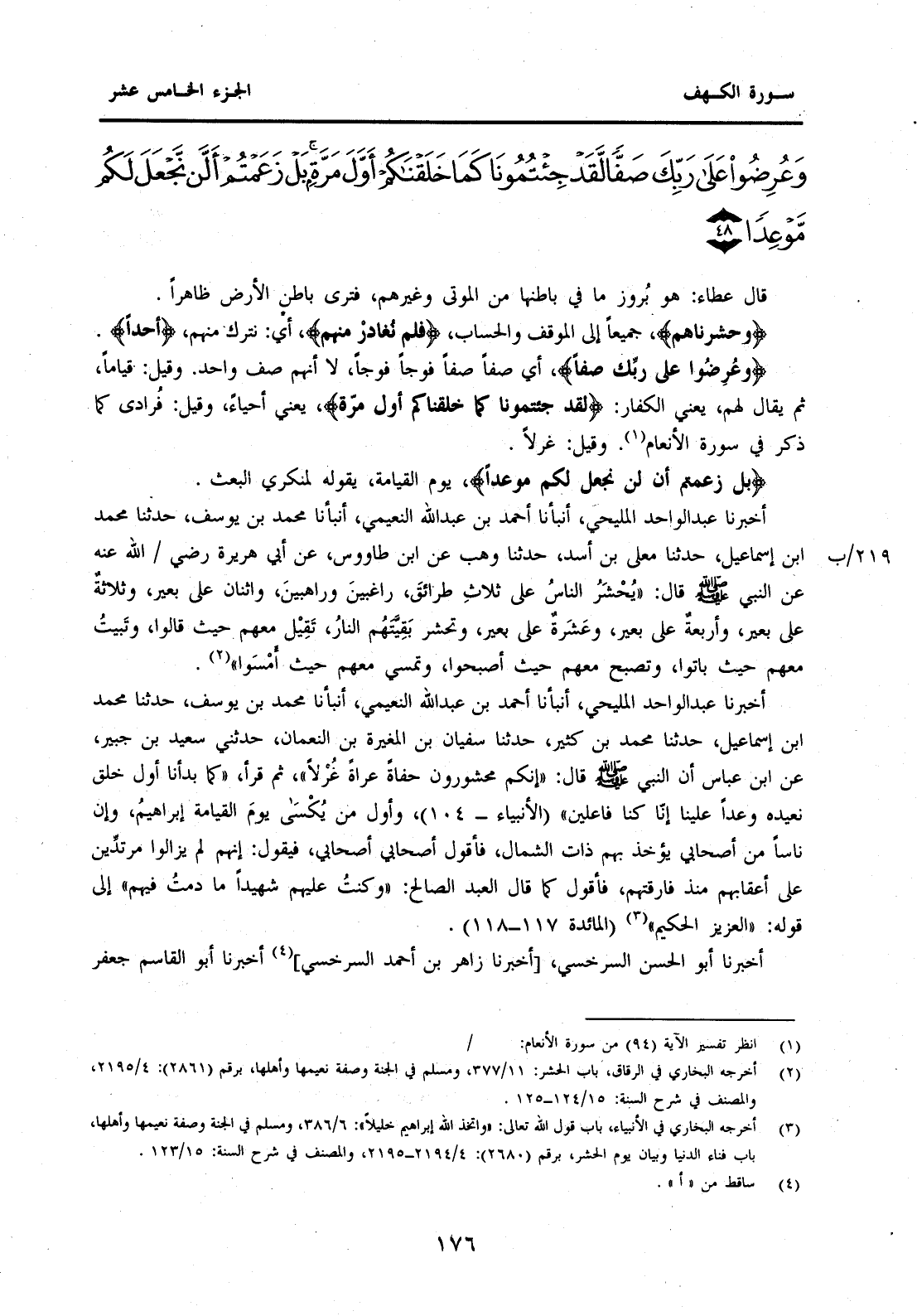 أَخْبَرَنَا عَبْدُ الْوَاحِدِ الْمَلِيحِيُّ أَنْبَأَنَا أَحْمَدُ بْنُ عَبْدِ اللَّهِ النَّعِيمِيُّ أَنْبَأَنَا مُحَمَّدُ بْنُ يُوسُفَ حَدَّثَنَا مُحَمَّدُ بْنُ إِسْمَاعِيلَ حَدَّثَنَا مُحَمَّدُ بْنُ كَثِيرٍ حَدَّثَنَا سُفْيَانُ بْنُ الْمُغِيرَةِ بْنِ النُّعْمَانِ حَدَّثَنِي سَعِيدُ بْنُ جُبَيْرٍ عَنِ ابْنِ عَبَّاسٍ أَنَّ النَّبِيَّ صَلَّى اللَّهُ عَلَيْهِ وَسَلَّمَ قَالَ: "إِنَّكُمْ مَحْشُورُونَ حُفَاةً عُرَاةً غُرْلًا" ثُمَّ قَرَأَ "كَمَا بَدَأْنَا أَوَّلَ خَلْقٍ نُعِيدُهُ وَعْدًا عَلَيْنَا إِنَّا كُنَّا فَاعِلِينَ" (الْأَنْبِيَاءِ-104) وَأَوَّلُ مَنْ يُكْسَى يَوْمَ الْقِيَامَةِ إِبْرَاهِيمُ وَإِنَّ نَاسًا مِنْ أَصْحَابِي يُؤْخَذُ بِهِمْ ذَاتَ الشِّمَالِ فَأَقُولُ أَصْحَابِي أَصْحَابِي فَيَقُولُ: إِنَّهُمْ لَمْ يَزَالُوا مُرْتَدِّينَ عَلَى أَعْقَابِهِمْ مُنْذُ فَارَقْتَهُمْ فَأَقُولُ كَمَا قَالَ الْعَبْدُ الصَّالِحُ: "وَكُنْتُ عَلَيْهِمْ شَهِيدًا مَا دُمْتُ فِيهِمْ" إِلَى قَوْلِهِ: "الْعَزِيزُ الْحَكِيمُ" (3) (الْمَائِدَةِ 117-118) .