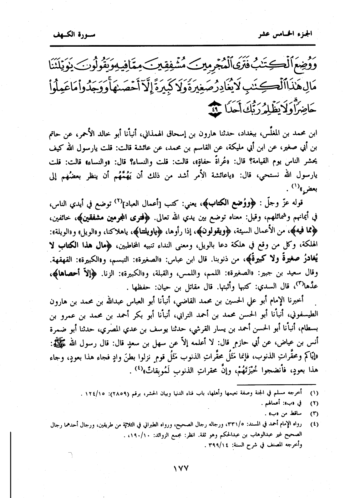 قَوْلُهُ عَزَّ وَجَلَّ: {وَوُضِعَ الْكِتَابُ} يَعْنِي: كُتُبَ [أَعْمَالِ الْعِبَادِ] (2) تُوضَعُ فِي أَيْدِي النَّاسِ فِي أَيْمَانِهِمْ وَشَمَائِلِهِمْ وَقِيلَ: مَعْنَاهُ تُوضَعُ بَيْنَ يَدَيِ اللَّهِ تَعَالَى {فَتَرَى الْمُجْرِمِينَ مُشْفِقِينَ} خَائِفِينَ {مِمَّا فِيهِ} مِنَ الْأَعْمَالِ السَّيِّئَةِ {وَيَقُولُونَ} إِذَا رَأَوْهَا {يَا وَيْلَتَنَا} يَا هَلَاكَنَا وَ"الْوَيْلُ" وَ"الْوَيْلَةُ": الْهَلَكَةُ وَكُلُّ مَنْ وَقَعَ فِي هَلَكَةٍ دَعَا بِالْوَيْلِ وَمَعْنَى النِّدَاءِ تنبيه المخاطبين {مَالِ هَذَا الْكِتَابِ لَا يُغَادِرُ صَغِيرَةً وَلَا كَبِيرَةً} مِنْ ذُنُوبِنَا. قَالَ ابْنُ عَبَّاسٍ: "الصَّغِيرَةُ": التَّبَسُّمُ وَ"الْكَبِيرَةُ": الْقَهْقَهَةُ وَقَالَ سَعِيدُ بْنُ جُبَيْرٍ: "الصَّغِيرَةُ": اللَّمَمُ وَاللَّمْسُ وَالْقُبْلَةُ وَ"الْكَبِيرَةُ": الزِّنَا. {إِلَّا أَحْصَاهَا} عَدَّهَا (3) قَالَ السُّدِّيُّ: كَتَبَهَا وَأَثْبَتَهَا قَالَ مُقَاتِلُ بْنُ حَيَّانَ حَفِظَهَا.