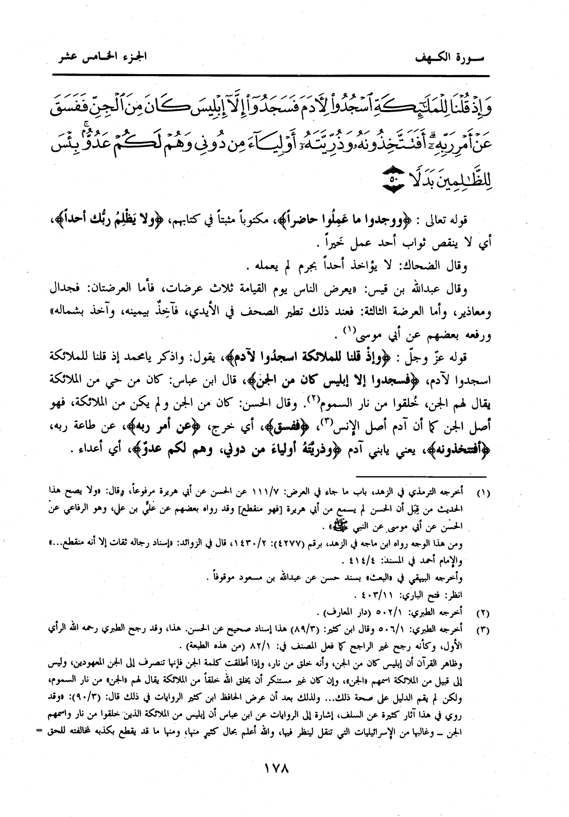 (3) أخرجه الطبري: 1 / 506 وقال ابن كثير: (3 / 89) هذا إسناد صحيح عن الحسن. وقد رجح الطبري رحمه الله الرأي الأول وكأنه رجح غير الراجح كما فعل المصنف في: 1 / 82 (من هذه الطبعة) . وظاهر القرآن أن إبليس كان من الجن وأنه خلق من نار وإذا أطلقت كلمة الجن فإنها تنصرف إلى الجن المعهودين وليس إلى قبيل من الملائكة يقال لهم "الجن" من نار السموم ولكن لم يقم الدليل على صحة ذلك ... ولذلك بعد أن عرض الحافظ ابن كثير الروايات في ذلك قال: (3 / 90) : "وقد روي في هذا آثار كثيرة عن السلف إشارة إلى الروايات عن ابن عباس أن إبليس من الملائكة الذين خلقوا من نار واسمهم الجن -وغالبها من الإسرائيليات التي تنقل لينظر فيها والله أعلم بحال كثير منها ومنها ما قد يقطع بكذبه لمخالفته للحق الذي بأيدينا وفي القرآن غنية عن كل ما عداه من الأخبار المتقدمة لأنها لا تكاد تخلو من تبديل وزيادة ونقصان وقد وضع فيها أشياء كثيرة وليس لهم من الحفاظ المتقنين الذين ينفون عنها تحريف الغالين وانتحال المبطلين كما لهذه الأمة من الأئمة والعلماء والسادة والأتقياء والبررة والنجباء من الجهابذة النقاد والحفاظ الجياد الذين دونوا الحديث وحرروه وبينوا صحيحه من حسنه من ضعيفه من منكره وموضوعه ومتروكه ومكذوبه وعرفوا الوضاعين والكذابين والمجهولين وغير ذلك من أصناف الرجال. كل ذلك صيانة للجناب النبوي والمقام المحمدي خاتم الرسل وسيد البشر صَلَّى اللَّهُ عَلَيْهِ وَسَلَّمَ أن ينسب إليه كذب أو يحدث عنه بما ليس منه، فرضي الله عنهم وأرضاهم وجعل جنات الفردوس مأواهم".
