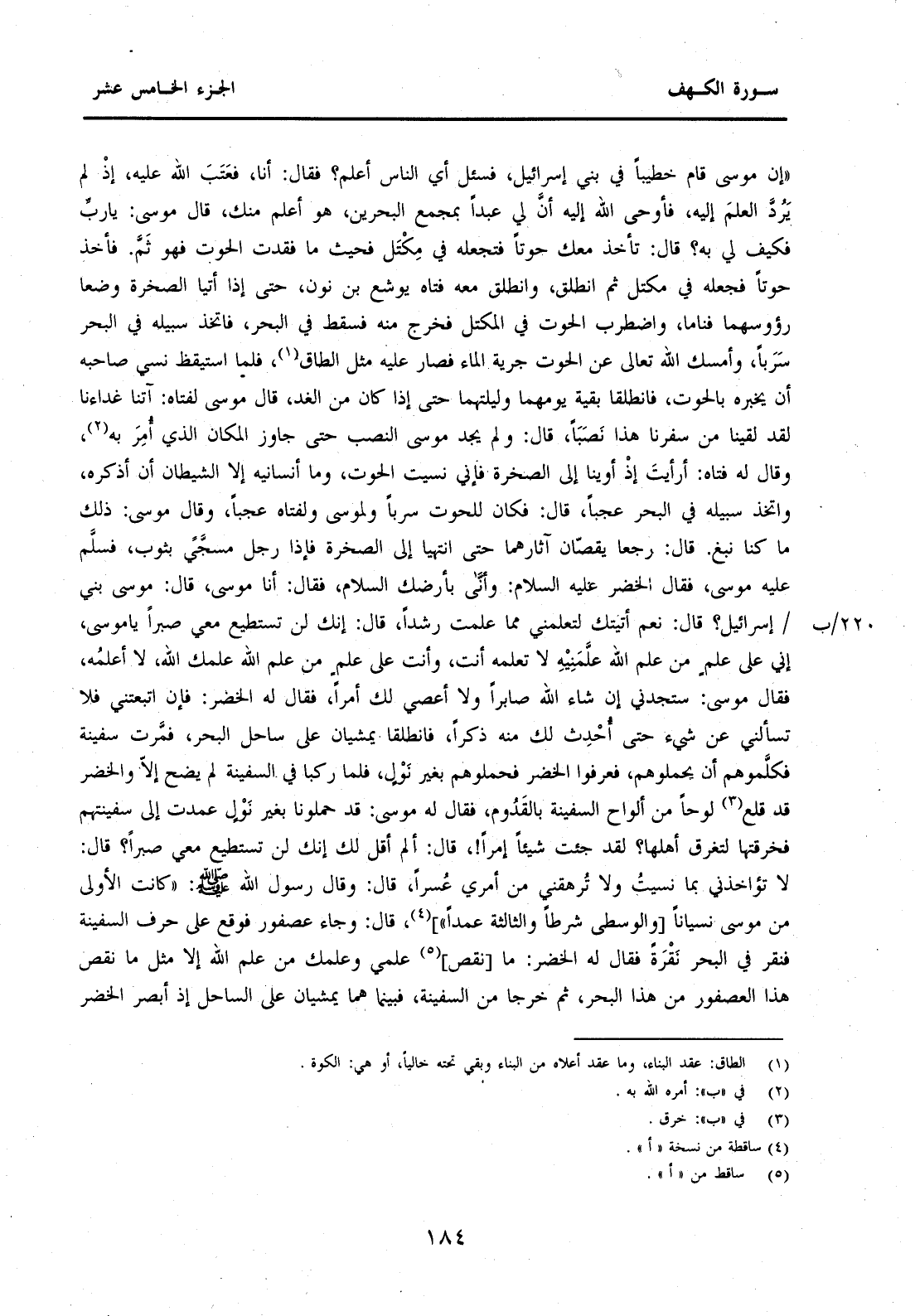 "إِنَّ مُوسَى قَامَ خَطِيبًا فِي بَنِي إِسْرَائِيلَ فَسُئِلَ أَيُّ النَّاسِ أَعْلَمُ؟ فَقَالَ: أَنَا، فَعَتَبَ اللَّهُ عَلَيْهِ إِذْ لَمْ يَرُدَّ الْعِلْمَ إِلَيْهِ، فَأَوْحَى اللَّهُ إِلَيْهِ أَنَّ لِي عَبْدًا بِمَجْمَعِ الْبَحْرَيْنِ هُوَ أَعْلَمُ مِنْكَ، قَالَ مُوسَى: يَا رَبِّ فَكَيْفَ لِي بِهِ؟ قَالَ: تَأْخُذُ مَعَكَ حُوتًا فَتَجْعَلُهُ فِي مِكْتَلٍ فَحَيْثُ مَا فَقَدْتَ الْحُوتَ فَهُوَ ثَمَّ. فَأَخَذَ حُوتًا فَجَعَلَهُ فِي مِكْتَلٍ ثُمَّ انْطَلَقَ وَانْطَلَقَ مَعَهُ فَتَاهُ يُوشَعُ بْنُ نُونَ حَتَّى إِذَا أَتَيَا الصَّخْرَةَ وَضْعَا رُءُوسَهُمَا فَنَامَا وَاضْطَرَبَ الْحُوتُ فِي الْمِكْتَلِ فَخَرَجَ مِنْهُ فَسَقَطَ فِي الْبَحْرِ، فَاتَّخَذَ سَبِيلَهُ فِي الْبَحْرِ سَرَبًا وَأَمْسَكَ اللَّهُ تَعَالَى عَنِ الحوت جرية المار فَصَارَ عَلَيْهِ مِثْلُ الطَّاقِ (1) فَلَمَّا اسْتَيْقَظَ نَسِيَ صَاحِبُهُ أَنْ يُخْبِرَهُ بِالْحُوتِ فَانْطَلَقَا بَقِيَّةَ يَوْمِهِمَا وَلَيْلَتَهُمَا حَتَّى إِذَا كَانَ مِنَ الْغَدِ قَالَ مُوسَى لِفَتَاهُ: آتِنَا غَدَاءَنَا لَقَدْ لَقِينَا مِنْ سَفَرِنَا هَذَا نَصَبًا قَالَ: وَلَمْ يَجِدْ مُوسَى النَّصَبَ حَتَّى جَاوَزَ الْمَكَانَ الَّذِي أُمِرَ بِهِ (2) وَقَالَ لَهُ فَتَاهُ: أَرَأَيْتَ إِذْ أَوَيْنَا إِلَى الصَّخْرَةِ فَإِنِّي نَسِيتُ الْحُوتَ وَمَا أَنْسَانِيهُ إِلَّا الشَّيْطَانُ أَنْ أَذْكُرَهُ وَاتَّخَذَ سَبِيلَهُ فِي الْبَحْرِ عَجَبًا قَالَ: فَكَانَ لِلْحُوتِ سَرَبًا وَلِمُوسَى وَلِفَتَاهُ عَجَبًا وَقَالَ مُوسَى: ذَلِكَ مَا كُنَّا نَبْغِ قَالَ: رَجَعَا يَقُصَّانِ آثَارَهُمَا حَتَّى انْتَهَيَا إِلَى الصَّخْرَةِ فَإِذَا رَجُلٌ مُسَجًّى بِثَوْبٍ فَسَلَّمَ عَلَيْهِ مُوسَى فَقَالَ الْخَضِرُ عَلَيْهِ السَّلَامُ: وَأَنَّى بِأَرْضِكَ السَّلَامُ، فَقَالَ: أَنَا مُوسَى قَالَ: موسى بنى 220/ب إِسْرَائِيلَ؟ قَالَ: نَعَمْ أَتَيْتُكَ لِتُعَلِّمَنِي مِمَّا عُلِّمْتَ رُشْدًا، قَالَ: إِنَّكَ لَنْ تَسْتَطِيعَ مَعِيَ صَبْرًا يَا مُوسَى، إِنِّي عَلَى عِلْمٍ مِنَ اللَّهِ عَلَّمَنِيهُ لَا تَعْلَمُهُ أَنْتَ، وَأَنْتَ عَلَى عِلْمٍ مِنْ عِلْمِ اللَّهِ عَلَّمَكَ اللَّهُ لَا أَعْلَمُهُ فَقَالَ مُوسَى: سَتَجِدُنِي إِنْ شَاءَ اللَّهُ صَابِرًا وَلَا أَعْصِي لَكَ أَمْرًا، فَقَالَ لَهُ الْخَضِرُ: فَإِنِ اتَّبَعْتَنِي فَلَا تَسْأَلْنِي عَنْ شَيْءٍ حَتَّى أُحْدِثَ لَكَ مِنْهُ ذِكْرًا، فَانْطَلَقَا يَمْشِيَانِ عَلَى سَاحِلِ الْبَحْرِ فَمَرَّتْ سَفِينَةٌ فَكَلَّمُوهُمْ أَنْ يَحْمِلُوهُمْ، فَعَرَفُوا الْخَضِرَ فَحَمَلُوهُمْ بِغَيْرِ نَوْلٍ، فَلَمَّا رَكِبَا فِي السَّفِينَةِ لَمْ يُضْحِ إِلَّا وَالْخَضِرُ قَدْ قَلَعَ (3) لَوْحًا مِنْ أَلْوَاحِ السَّفِينَةِ بِالْقَدُومِ، فَقَالَ لَهُ مُوسَى: قَوْمٌ حَمَلُونَا بِغَيْرِ نَوْلٍ عَمَدْتَ إِلَى سَفِينَتِهِمْ فَخَرَقْتَهَا لِتُغْرِقَ أَهْلَهَا؟ لَقَدْ جِئْتَ شَيْئًا إِمْرًا! قَالَ: أَلَمْ أَقُلْ لَكَ إِنَّكَ لَنْ تَسْتَطِيعَ مَعِيَ صَبْرًا؟ قَالَ: لَا تُؤَاخِذْنِي بِمَا نَسِيتُ وَلَا تُرْهِقْنِي مِنْ أَمْرِي عُسْرًا، قَالَ: وَقَالَ رَسُولُ اللَّهِ صَلَّى اللَّهُ عَلَيْهِ وَسَلَّمَ: "كَانَتِ الْأُولَى مِنْ مُوسَى نِسْيَانًا [وَالْوُسْطَى شَرْطًا وَالثَّالِثَةُ عَمْدًا"] (4) قَالَ: وَجَاءَ عُصْفُورٌ فَوَقَعَ عَلَى حَرْفِ السَّفِينَةِ فَنَقَرَ فِي الْبَحْرِ نَقْرَةً فَقَالَ لَهُ الْخَضِرُ: مَا [نَقَصَ] (5) عِلْمِي وَعِلْمُكَ مِنْ عِلْمِ اللَّهِ إِلَّا مِثْلُ مَا نَقَصَ هَذَا الْعُصْفُورُ مِنْ هَذَا الْبَحْرِ، ثُمَّ خَرَجَا مِنَ السَّفِينَةِ، فَبَيْنَمَا هُمَا يَمْشِيَانِ عَلَى السَّاحِلِ إِذْ أَبْصَرَ الْخَضِرُ غُلَامًا يَلْعَبُ 