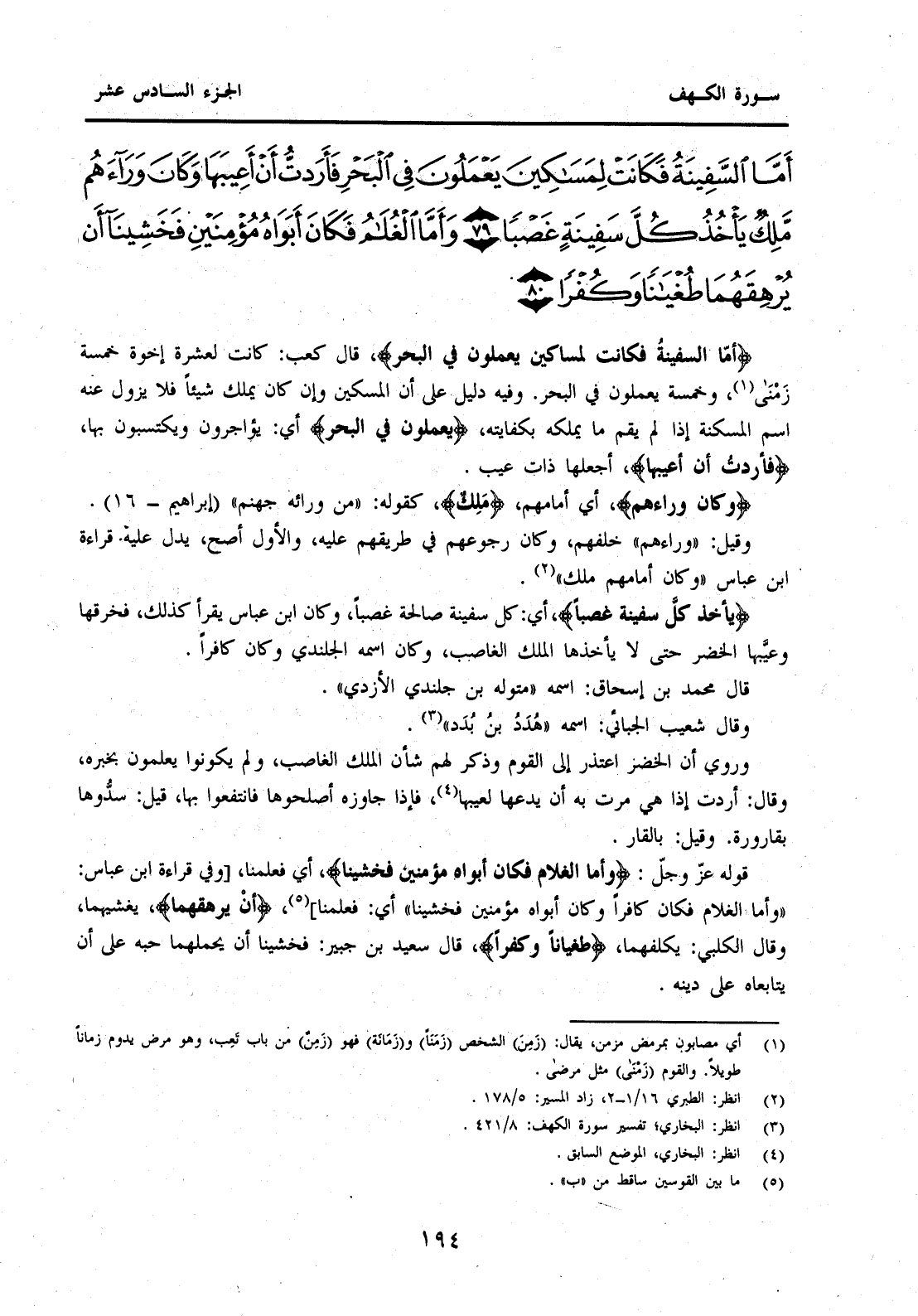 وَرُوِيَ أَنَّ الْخَضِرَ اعْتَذَرَ إِلَى الْقَوْمِ وَذَكَرَ لَهُمْ شَأْنَ الْمَلِكِ الْغَاصِبِ وَلَمْ يَكُونُوا يَعْلَمُونَ بِخَبَرِهِ وَقَالَ: أَرَدْتُ إِذَا هِيَ مَرَّتْ بِهِ أَنْ يَدَعَهَا لعيبها (4) فإذا جاوزه أَصْلَحُوهَا فَانْتَفَعُوا بِهَا قِيلَ: سَدُّوهَا بِقَارُورَةٍ وَقِيلَ: بِالْقَارِ. قَوْلُهُ عَزَّ وَجَلَّ: {وَأَمَّا الْغُلَامُ فَكَانَ أَبَوَاهُ مُؤْمِنَيْنِ فَخَشِينَا} أَيْ فَعَلِمْنَا [وَفِي قِرَاءَةِ ابْنِ عَبَّاسٍ: "وَأَمَّا الْغُلَامُ فَكَانَ كَافِرًا وَكَانَ أَبَوَاهُ مُؤْمِنِينَ فَخَشِينَا" أَيْ: فَعَلِمْنَا] (5) {أَنْ يُرْهِقَهُمَا} يُغْشِيَهُمَا وَقَالَ الْكَلْبِيُّ: يُكَلِّفَهُمَا {طُغْيَانًا وَكُفْرًا} قَالَ سَعِيدُ بْنُ جُبَيْرٍ: فَخَشِينَا أَنْ يَحْمِلَهُمَا حُبُّهُ عَلَى أَنْ يُتَابِعَاهُ عَلَى دِينِهِ.