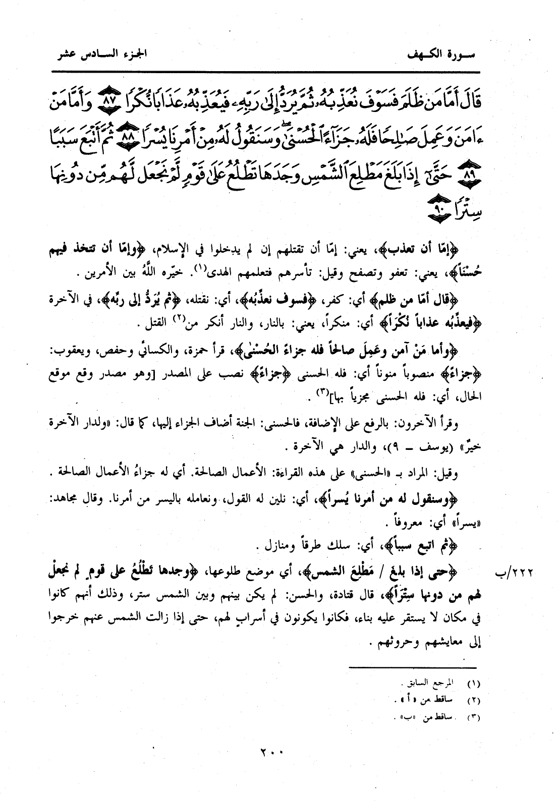 {وَسَنَقُولُ لَهُ مِنْ أَمْرِنَا يُسْرًا} أَيْ: نُلِينُ لَهُ الْقَوْلَ وَنُعَامِلُهُ بِالْيُسْرِ مِنْ أَمْرِنَا. وَقَالَ مُجَاهِدٌ: "يُسْرًا" أَيْ: مَعْرُوفًا. {ثُمَّ أَتْبَعَ سَبَبًا} أَيْ: سَلَكَ طرقا ومنازل. 222/ب {حَتَّى إِذَا بَلَغَ مَطْلِعَ الشَّمْسِ} أَيْ مَوْضِعَ طُلُوعِهَا {وَجَدَهَا تَطْلُعُ عَلَى قَوْمٍ لَمْ نَجْعَلْ لَهُمْ مِنْ دُونِهَا سِتْرًا} قَالَ قَتَادَةُ وَالْحَسَنُ: لَمْ يَكُنْ بَيْنَهُمْ وَبَيْنَ الشَّمْسِ سِتْرٌ، وَذَلِكَ أَنَّهُمْ كَانُوُا فِي مَكَانٍ لَا يَسْتَقِرُّ عَلَيْهِ بِنَاءٌ فَكَانُوا يَكُونُونَ فِي أَسْرَابٍ لَهُمْ حَتَّى إِذَا زَالَتِ الشَّمْسُ عَنْهُمْ خَرَجُوا إِلَى مَعَايِشِهِمْ وَحُرُوثِهِمْ.