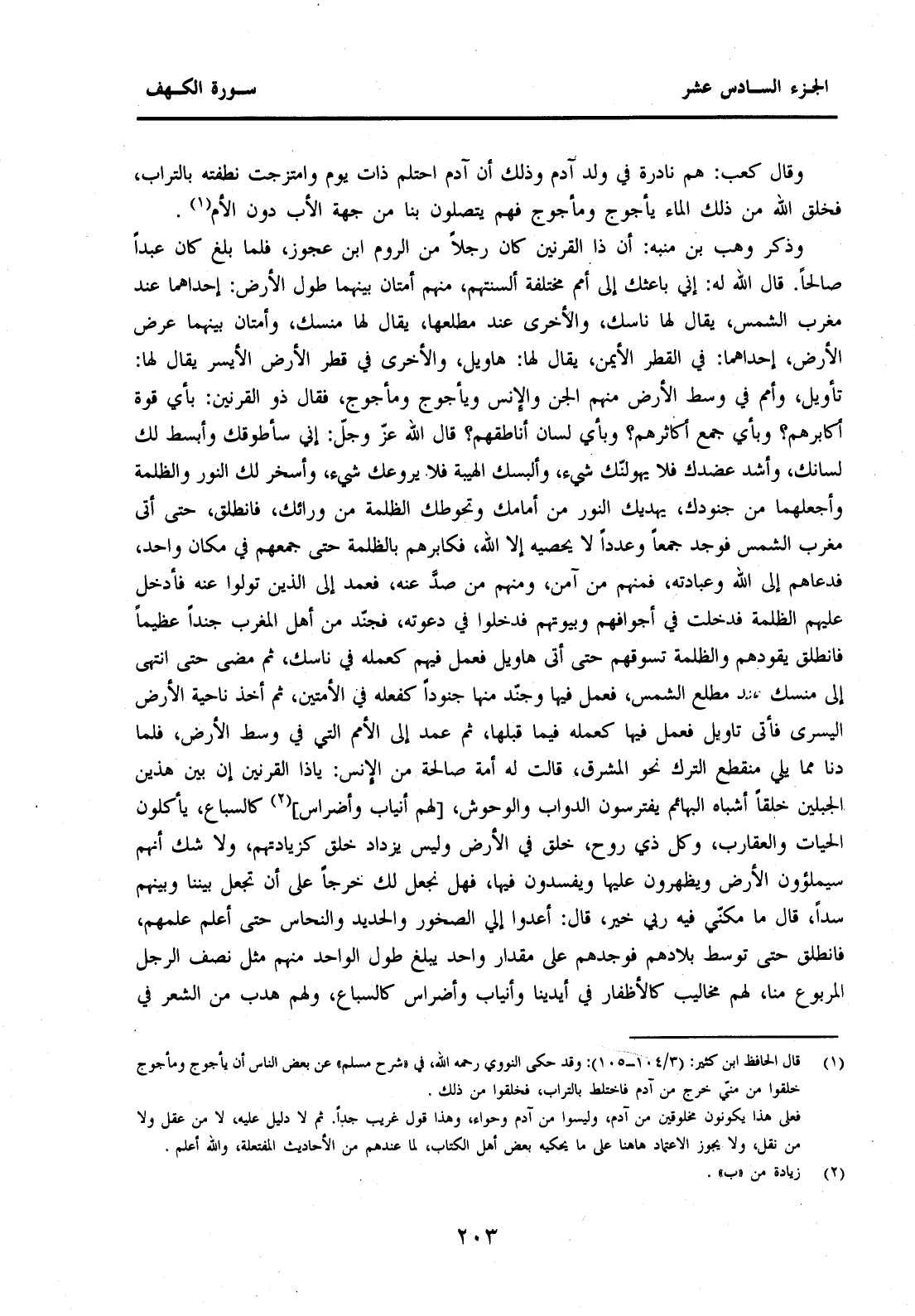 (1) قال الحافظ ابن كثير: (3 / 104-105) : وقد حكى النووي رحمه الله في "شرح مسلم" عن بعض الناس أن يأجوج ومأجوج خلقوا من مني خرج من آدم فاختلط بالتراب، فخلقوا من ذلك. فعلى هذا يكونون مخلوقين من آدم وليسوا من آدم وحواء، وهذا قول غريب جدا ثم لا دليل عليه لا من عقل ولا من نقل ولا يجوز الاعتماد هاهنا على ما يحكيه بعض أهل الكتاب لما عندهم من الأحاديث المفتعلة، والله أعلم.