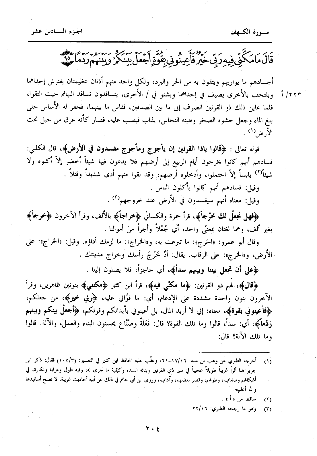 {قَالَ} لَهُمْ ذُو الْقَرْنَيْنِ: {مَا مَكَّنِّي فِيهِ} قَرَأَ ابْنُ كَثِيرٍ " مَكَّنَنِي " بِنُونَيْنِ ظَاهِرَيْنِ، وَقَرَأَ الْآخَرُونَ بِنُونٍ وَاحِدَةٍ مُشَدَّدَةٍ عَلَى الْإِدْغَامِ، أَيْ: مَا قَوَّانِي عَلَيْهِ {رَبِّي خَيْرٌ} مِنْ جُعْلِكُمْ {فَأَعِينُونِي بِقُوَّةٍ} مَعْنَاهُ: إِنِّي لَا أُرِيدُ الْمَالَ بَلْ أَعِينُونِي بِأَبْدَانِكُمْ وَقُوَّتِكُمْ {أَجْعَلْ بَيْنَكُمْ وَبَيْنَهُمْ رَدْمًا} أَيْ: سَدًّا، قَالُوا وَمَا تِلْكَ الْقُوَّةُ؟ قَالَ: فَعَلَةٌ وَصُنَّاعٌ يُحْسِنُونَ الْبِنَاءَ وَالْعَمَلَ وَالْآلَةُ، قَالُوا: وما تلك الآية؟ قَالَ: