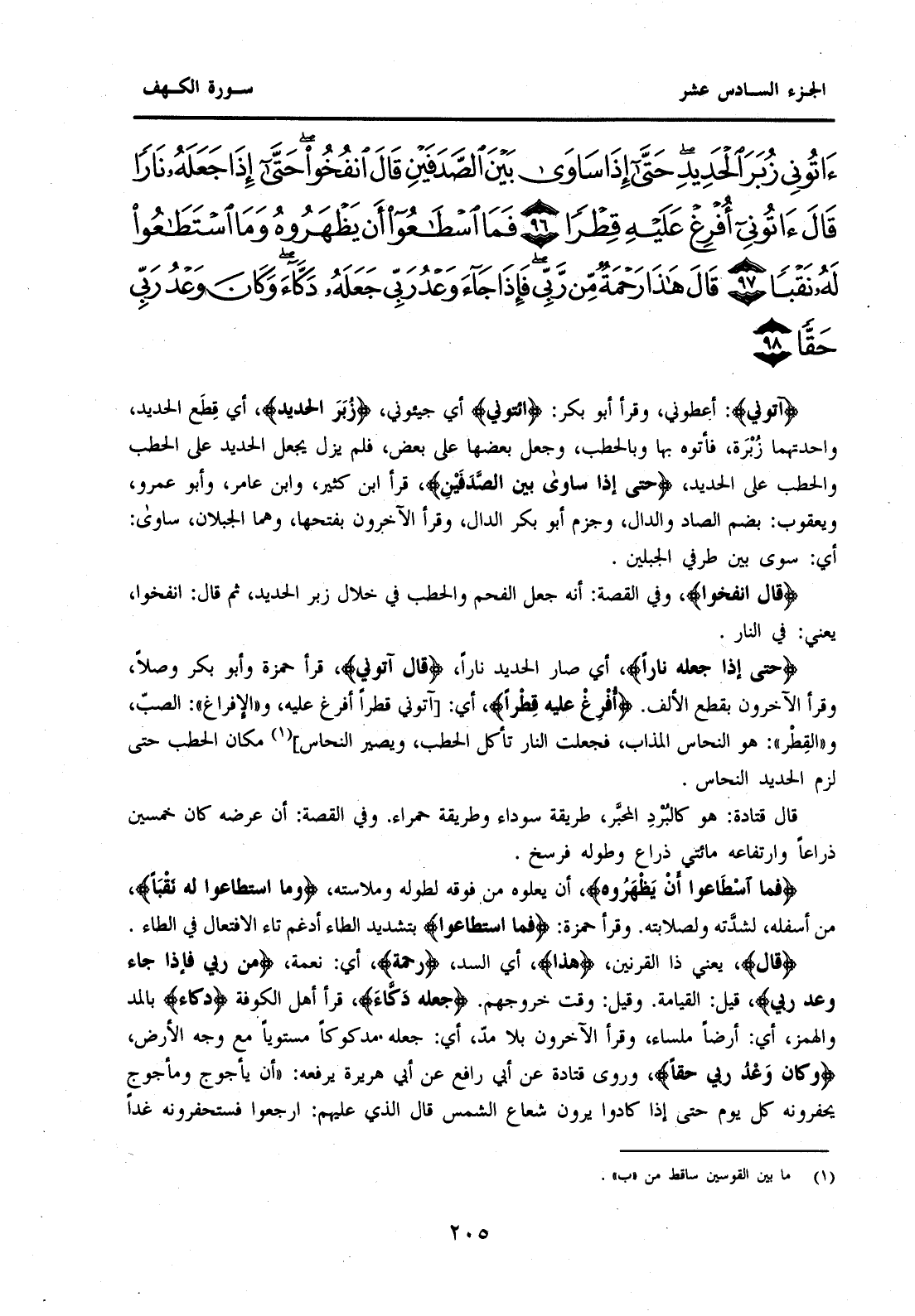 {آتُونِي} أَعْطُوْنِي وَقَرَأَ أَبُو بَكْرٍ: " ائْتُونِي " أَيْ جِيئُونِي {زُبَرَ الْحَدِيدِ} أَيْ قِطَعَ الْحَدِيدِ وَاحِدَتُهَا زُبْرَةٌ، فَآتَوْهُ بِهَا وَبِالْحَطَبِ وَجَعَلَ بَعْضَهَا عَلَى بَعْضٍ، فَلَمْ يَزَلْ يَجْعَلُ الْحَدِيدَ عَلَى الْحَطَبِ وَالْحَطَبَ عَلَى الْحَدِيدِ {حَتَّى إِذَا سَاوَى بَيْنَ الصَّدَفَيْنِ} قَرَأَ ابْنُ كَثِيرٍ وَابْنُ عَامِرٍ وَأَبُو عَمْرٍو وَيَعْقُوبُ: بِضَمِّ الصَّادِّ وَالدَّالِّ وَجَزَمَ أَبُو بَكْرٍ الدَّالَ وَقَرَأَ الْآخَرُونَ بِفَتْحِهَا وَهُمَا الْجَبَلَانِ سَاوَى: أَيْ سَوَّى بَيْنَ طَرَفَيِ الْجَبَلَيْنِ.