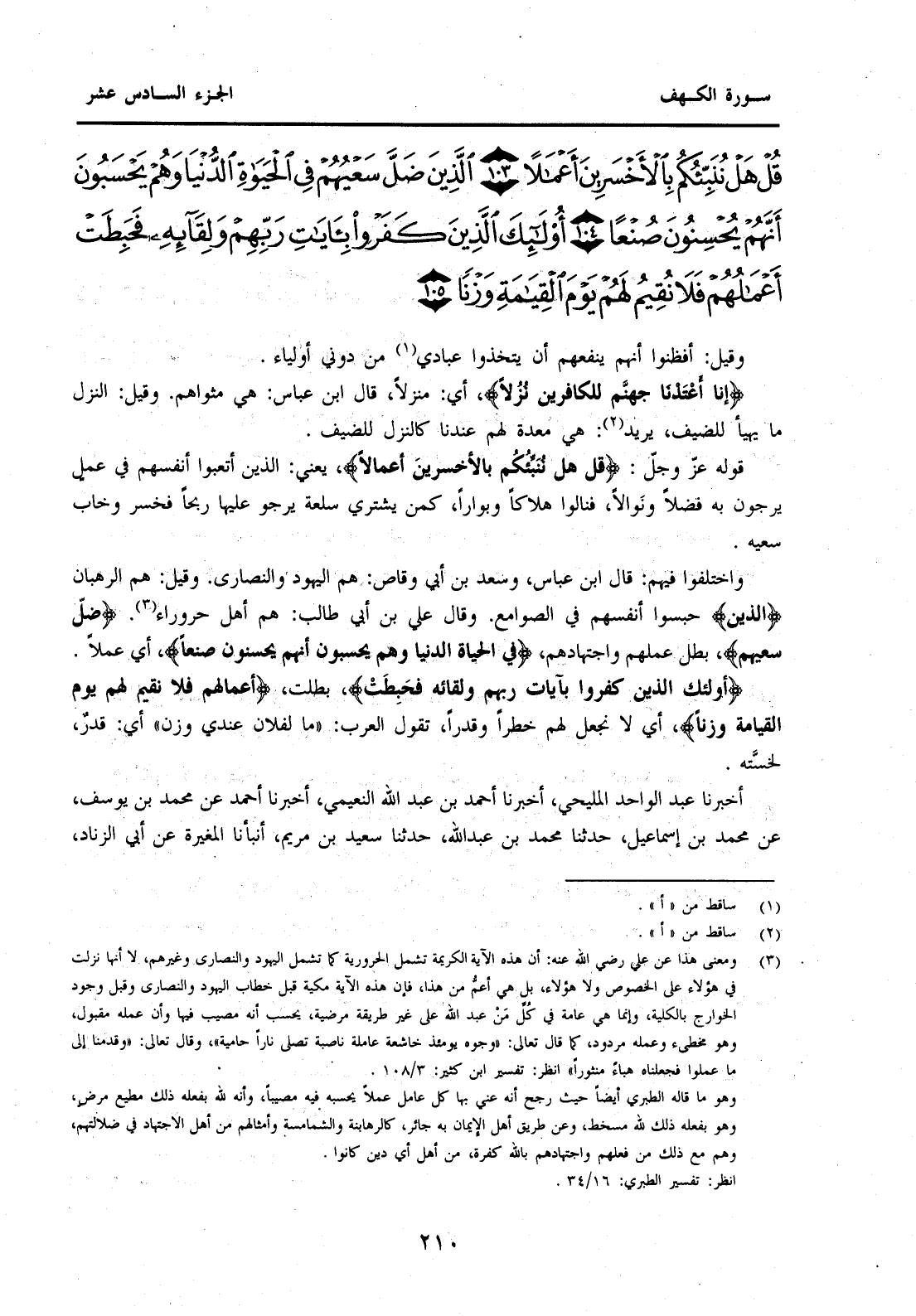 وَاخْتَلَفُوا فِيهِمْ: قَالَ ابْنُ عَبَّاسٍ وَسَعْدُ بْنُ أَبِي وَقَّاصٍ: هُمُ الْيَهُودُ وَالنَّصَارَى. وَقِيلَ: هُمُ الرُّهْبَانُ. {الَّذِينَ} حَبَسُوا أَنْفُسَهُمْ فِي الصَّوَامِعِ. وَقَالَ عَلِيُّ بْنُ أَبِي طَالِبٍ: هُمْ أَهْلُ حَرُورَاءَ (3) {ضَلَّ سَعْيُهُمْ} بَطَلَ عَمَلُهُمْ وَاجْتِهَادُهُمْ {فِي الْحَيَاةِ الدُّنْيَا وَهُمْ يَحْسَبُونَ أَنَّهُمْ يُحْسِنُونَ صُنْعًا} أَيْ عَمَلًا. {أُولَئِكَ الَّذِينَ كَفَرُوا بِآيَاتِ رَبِّهِمْ وَلِقَائِهِ فَحَبِطَتْ} بَطَلَتْ {أَعْمَالُهُمْ فَلَا نُقِيمُ لَهُمْ يَوْمَ الْقِيَامَةِ وَزْنًا} أَيْ لَا نَجْعَلُ لَهُمْ خَطَرًا وَقَدْرًا، تَقُولُ الْعَرَبُ: "مَا لِفُلَانٍ عِنْدِي وَزْنٌ" أَيْ: قَدْرٌ لِخِسَّتِهِ.
