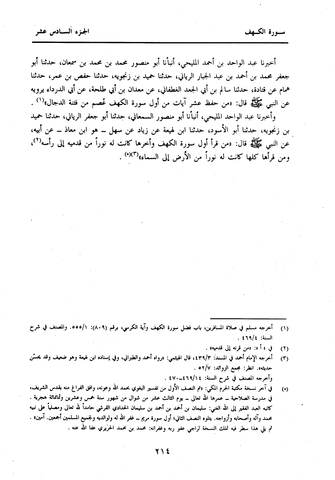 أَخْبَرَنَا عَبْدُ الْوَاحِدِ بْنُ أَحْمَدَ الْمَلِيحِيُّ أَنْبَأَنَا أَبُو مَنْصُورٍ مُحَمَّدُ بْنُ مُحَمَّدِ بْنِ سَمْعَانَ حَدَّثَنَا أَبُو جَعْفَرٍ مُحَمَّدُ بْنُ أَحْمَدَ بْنِ عَبْدِ الْجَبَّارِ الرَيَّانِيُّ حَدَّثَنَا حُمَيْدُ بْنُ زَنْجَوَيْهِ حَدَّثَنَا حَفْصُ بْنُ عُمَرَ حَدَّثَنَا هَمَّامٌ عَنْ قَتَادَةَ حَدَّثَنَا سَالِمُ بْنُ أَبِي الْجَعْدِ الغَطَفَانِيُّ عَنْ مَعْدَانَ بْنِ أَبِي طَلْحَةَ عَنْ أَبِي الدَّرْدَاءِ يَرْوِيهِ عَنِ النَّبِيِّ صَلَّى اللَّهُ عَلَيْهِ وَسَلَّمَ قَالَ: "مَنْ حَفِظَ عَشْرَ آيَاتٍ مِنْ أَوَّلِ سُورَةِ الْكَهْفِ عُصِمَ مِنْ فِتْنَةِ الدَّجَّالِ" (1) .