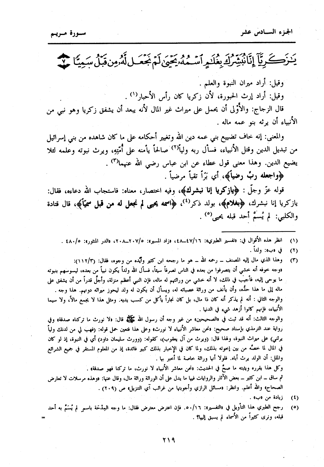 وَقِيلَ: أَرَادَ إِرْثَ الْحُبُورَةِ، لِأَنَّ زَكَرِيَّا كَانَ رَأْسَ الْأَحْبَارِ (1) .