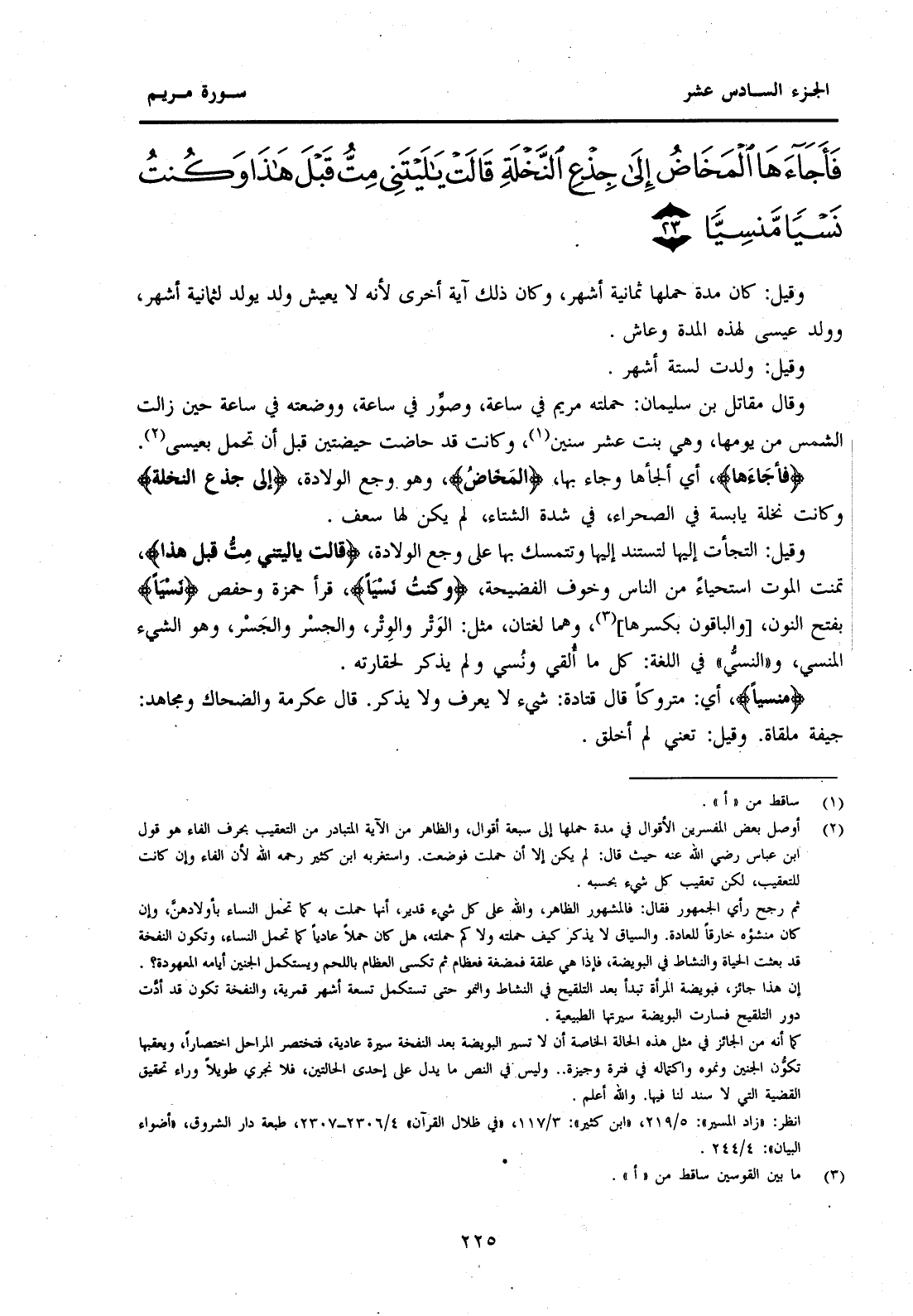 (2) أوصل بعض المفسرين الأقوال في مدة حملها إلى سبعة أقوال، والظاهر من الآية المتبادر من التعقيب بحرف الفاء هو قول ابن عباس رضي الله عنه حيث قال: لم يكن إلا أن حملت فوضعت. واستغربه ابن كثير رحمه الله لأن الفاء وإن كانت للتعقيب، لكن تعقيب كل شيء بحسبه. ثم رجح رأي الجمهور فقال: "فالمشهور الظاهر، والله على كل شيء قدير، أنها حملت به كما تحمل النساء بأولادهن، وإن كان منشؤه خارقا للعادة. والسياق لا يذكر كيف حملته ولا كم حملته، هل كان حملا عاديا كما تحمل النساء، وتكون النفخة قد بعثت الحياة والنشاط في البويضة، فإذا هي علقة فمضغة فعظام ثم تكسى العظام باللحم ويستكمل الجنين أيامه المعهودة؟ إن هذا جائز، فبويضة المرأة تبدأ بعد التلقيح في النشاط والنمو حتى تستكمل تسعة أشهر قمرية، والنفخة تكون قد أدت دور التلقيح فسارت البويضة سيرتها الطبيعية. كما أنه من الجائز في مثل هذه الحالة الخاصة أن لا تسير البويضة بعد النفخة سيرة عادية، فتختصر المراحل اختصارا، ويعقبها تكون الجنين ونموه واكتماله في فترة وجيزة.. وليس في النص ما يدل على إحدى الحالتين، فلا نجري طويلا وراء تحقيق القضية التي لا سند لنا فيها. والله أعلم. انظر: "زاد المسير": 5 / 219، "ابن كثير": 3 / 117، "في ظلال القرآن" 4 / 2306-2307، طبعة دار الشروق، "أضواء البيان": 4 / 244.
