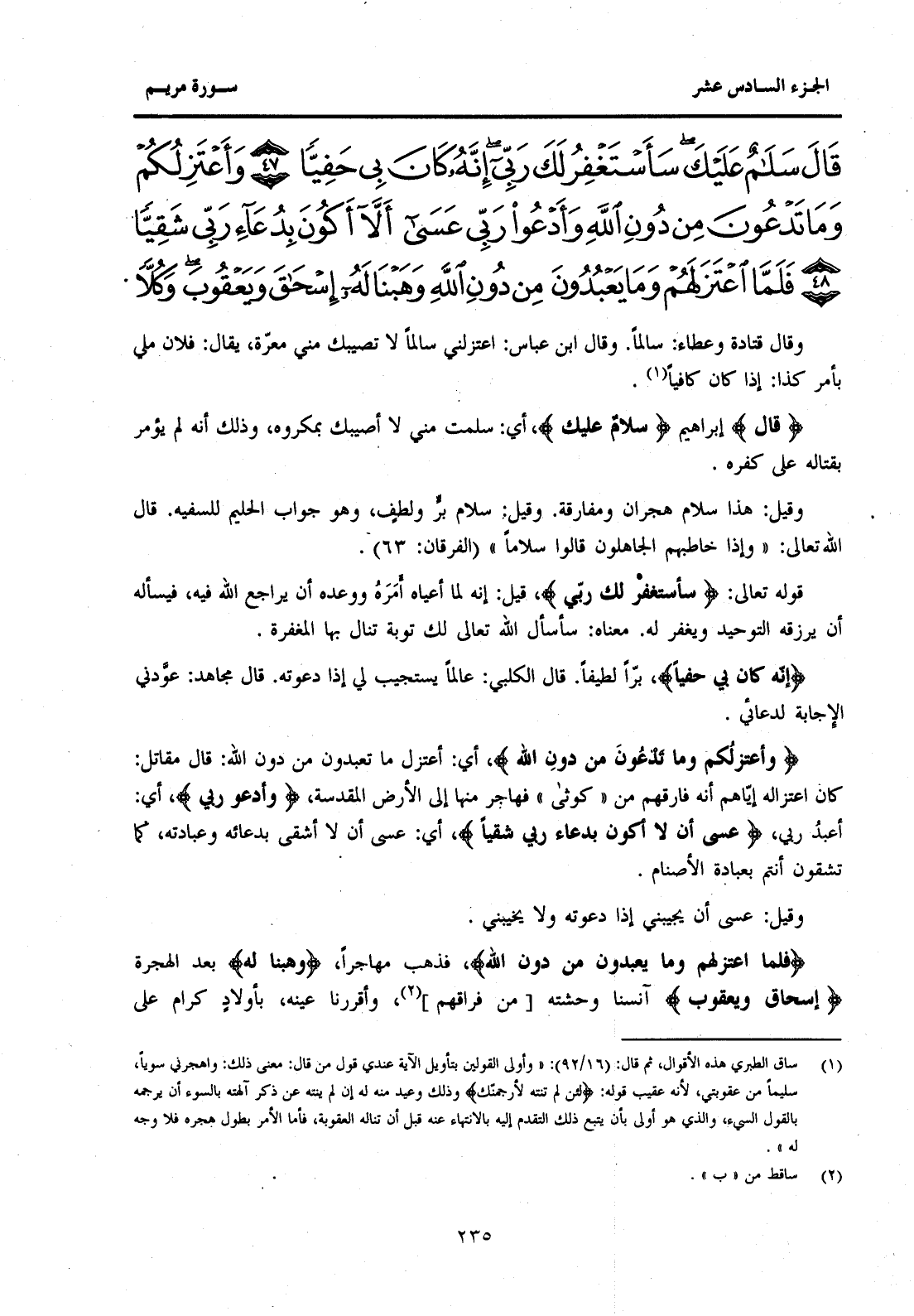 {قَالَ سَلَامٌ عَلَيْكَ سَأَسْتَغْفِرُ لَكَ رَبِّي إِنَّهُ كَانَ بِي حَفِيًّا (47) وَأَعْتَزِلُكُمْ وَمَا تَدْعُونَ مِنْ دُونِ اللَّهِ وَأَدْعُو رَبِّي عَسَى أَلَّا أَكُونَ بِدُعَاءِ رَبِّي شَقِيًّا (48) فَلَمَّا اعْتَزَلَهُمْ وَمَا يَعْبُدُونَ مِنْ دُونِ اللَّهِ وَهَبْنَا لَهُ إِسْحَاقَ وَيَعْقُوبَ وَكُلًّا جَعَلْنَا نَبِيًّا (49) }
