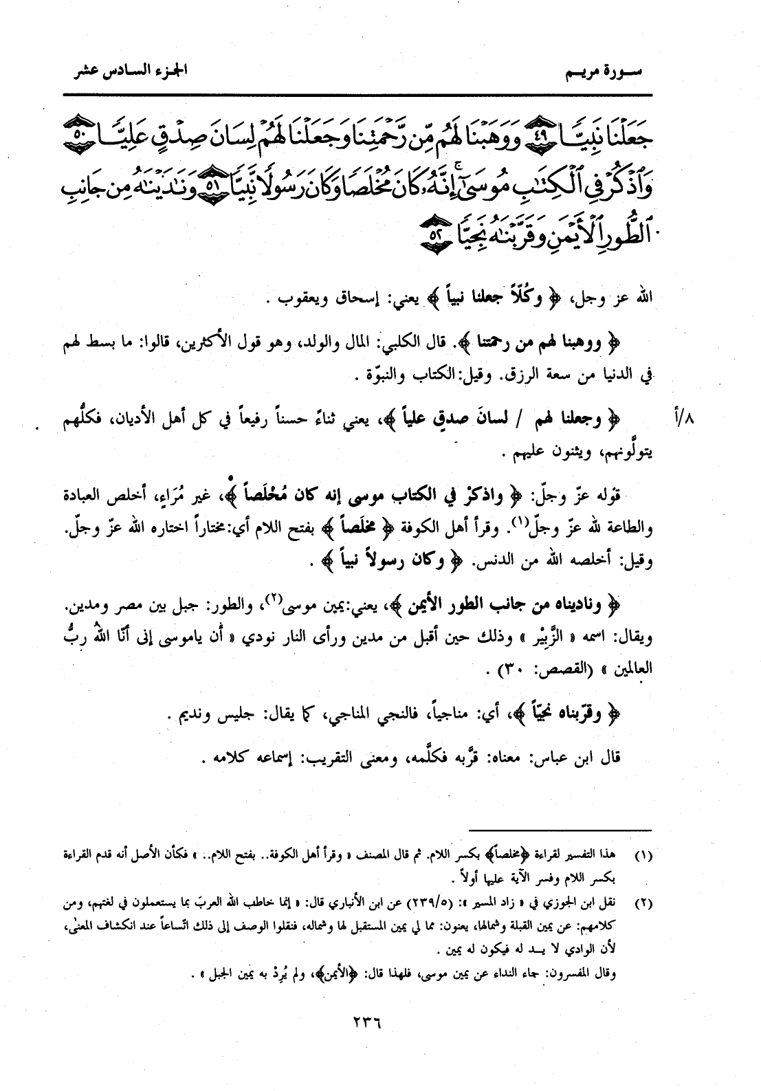 {وَجَعَلْنَا لَهُمْ لِسَانَ صِدْقٍ عَلِيًّا} 8/أيَعْنِي ثَنَاءً حَسَنًا رَفِيعًا فِي كُلِّ أَهْلِ الْأَدْيَانِ، فَكُلُّهُمْ يَتَوَلَّوْنَهُمْ، وَيُثْنُونَ عَلَيْهِمْ. قَوْلُهُ عَزَّ وَجَلَّ {وَاذْكُرْ فِي الْكِتَابِ مُوسَى إِنَّهُ كَانَ مُخْلَصًا} غَيْرَ مُرَاءٍ أَخْلَصَ الْعِبَادَةَ وَالطَّاعَةَ لِلَّهِ عَزَّ وَجَلَّ (1) وَقَرَأَ أَهْلُ الْكُوفَةِ " مُخْلَصًا " بِفَتْحِ اللَّامِ أَيْ: مُخْتَارًا اخْتَارَهُ اللَّهُ عَزَّ وَجَلَّ وَقِيلَ: أَخْلَصَهُ اللَّهُ مِنَ الدَّنَسِ. {وَكَانَ رَسُولًا نَبِيًّا} {وَنَادَيْنَاهُ مِنْ جَانِبِ الطُّورِ الْأَيْمَنِ} يَعْنِي: يَمِينَ مُوسَى (2) وَالطَّورُ: جَبَلٌ بَيْنَ مِصْرَ وَمَدْيَنَ. وَيُقَالُ: اسْمُهُ "الزُّبَيْرُ" وَذَلِكَ حِينَ أَقْبَلَ مِنْ مَدْيَنَ وَرَأَى النَّارَ فَنُودِيَ "يَا مُوسَى إِنِّي أَنَا اللَّهُ رَبُّ الْعَالَمِينَ" (القَصَصِ:30) .