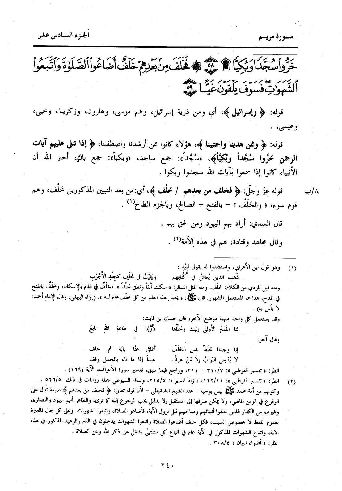 قَوْلُهُ عَزَّ وَجَلَّ: {فَخَلَفَ مِنْ بَعْدِهِمْ خَلْفٌ} 8/ب أَيْ: مِنْ بَعْدِ النَّبِيِّينَ الْمَذْكُورِينَ خَلْفٌ وَهُمْ قَوْمُ سُوءٍ، "وَالْخَلَفُ" -بِالْفَتْحِ-الصَّالِحُ، وَبِالْجَزْمِ الطَّالِحُ (1) .