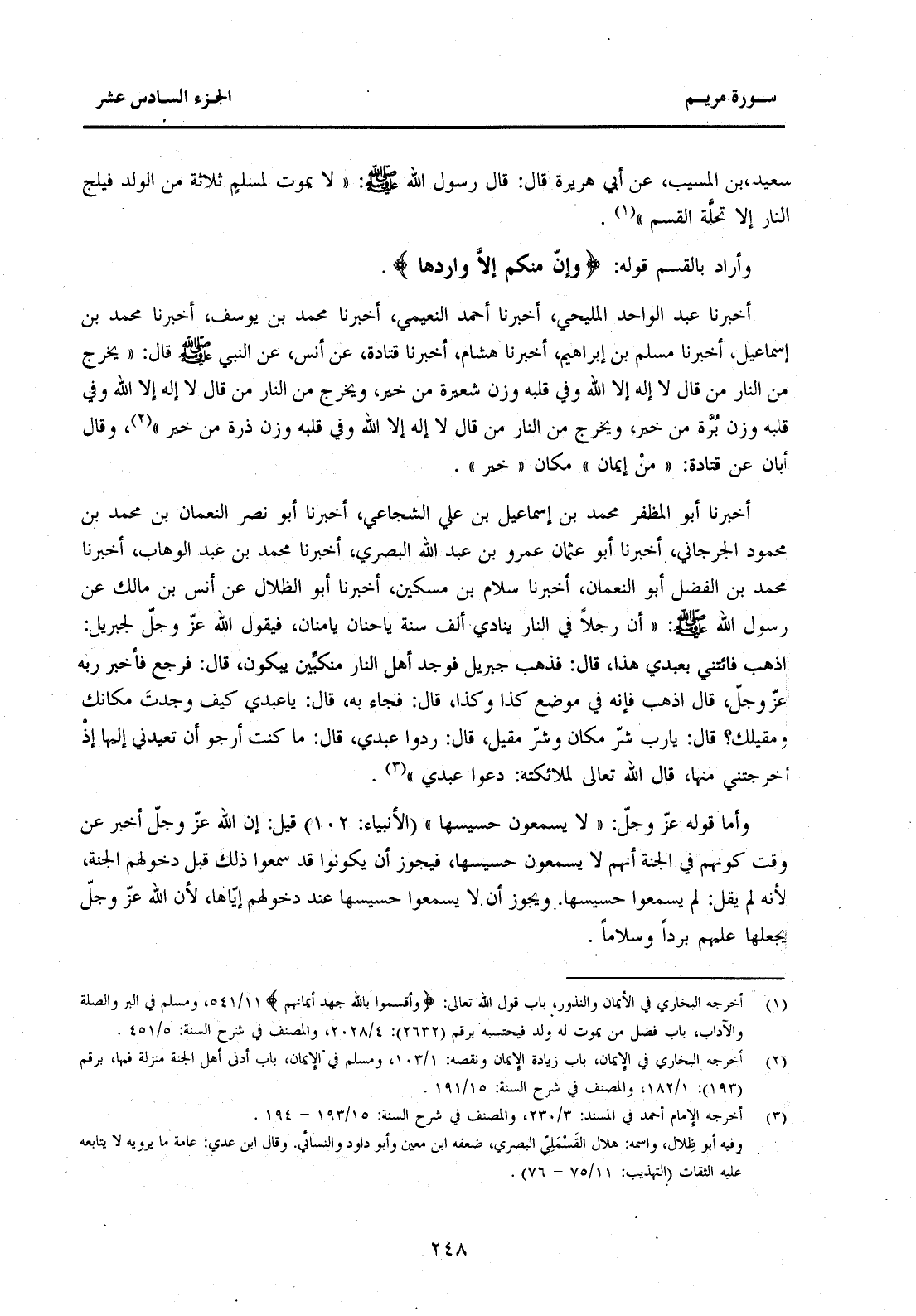 أَخْبَرَنَا عَبْدُ الْوَاحِدِ الْمَلِيحِيُّ أَخْبَرَنَا أَحْمَدُ النُّعَيْمِيُّ أَخْبَرَنَا مُحَمَّدُ بْنُ يُوسُفَ أَخْبَرَنَا مُحَمَّدُ بْنُ إِسْمَاعِيلَ أَخْبَرَنَا مُسْلِمُ بْنُ إِبْرَاهِيمَ أَخْبَرَنَا هِشَامٌ أَخْبَرَنَا قَتَادَةُ عَنْ أَنَسٍ عَنِ النَّبِيِّ صَلَّى اللَّهُ عَلَيْهِ وَسَلَّمَ قَالَ: "يَخْرُجُ مِنَ النَّارِ مَنْ قَالَ لَا إِلَهَ إِلَّا اللَّهُ وَفِي قَلْبِهِ وَزْنُ شَعِيرَةٍ مِنْ خَيْرٍ وَيَخْرُجُ مِنَ النَّارَ مَنْ قَالَ لَا إِلَهَ إِلَّا اللَّهُ وَفِي قَلْبِهِ وَزْنُ بُرَّةٍ مِنْ خَيْرٍ وَيَخْرُجُ مِنَ النَّارِ مَنْ قَالَ لَا إِلَهَ إِلَّا اللَّهُ وَفِي قَلْبِهِ وَزْنَ ذَرَّةٍ مِنْ خَيْرٍ" (2) وَقَالَ أَبَانُ عَنْ قَتَادَةَ: "مِنْ إِيمَانٍ" مَكَانَ "خَيْرٍ".