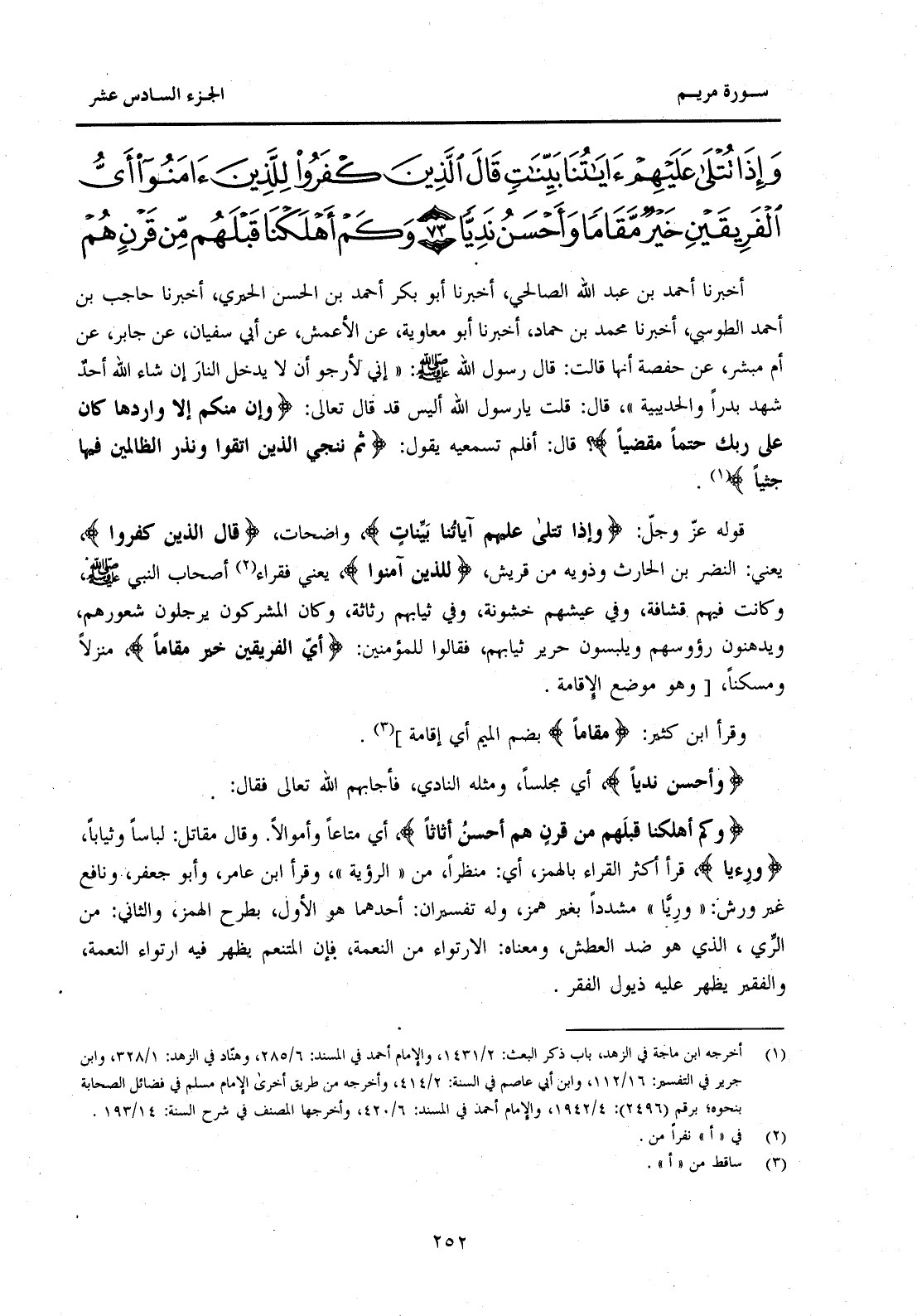 أَخْبَرَنَا أَحْمَدُ بْنُ عَبْدِ اللَّهِ الصَّالِحِيُّ أَخْبَرَنَا أَبُو بَكْرٍ أَحْمَدُ بْنُ الْحَسَنِ الْحِيرِيُّ أَخْبَرَنَا حَاجِبُ بْنُ أَحْمَدَ الطُّوسِيُّ أَخْبَرَنَا مُحَمَّدُ بْنُ حَمَّادٍ أَخْبَرَنَا أَبُو مُعَاوِيَةَ عَنِ الْأَعْمَشِ عَنْ أَبِي سُفْيَانَ عَنْ جَابِرٍ عَنْ أُمِّ مُبَشِّرٍ عَنْ حَفْصَةَ أَنَّهَا قَالَتْ: قَالَ رَسُولُ اللَّهِ صَلَّى اللَّهُ عَلَيْهِ وَسَلَّمَ: "إِنِّي لَأَرْجُو أَنْ لَا يَدْخُلَ النَّارَ إِنْ شَاءَ اللَّهُ أَحَدٌ شَهِدَ بَدْرًا وَالْحُدَيْبِيَةَ" قَالَ: قَلَتْ يَا رَسُولَ اللَّهِ أَلَيْسَ قَدْ قَالَ اللَّهُ تَعَالَى: {وَإِنْ مِنْكُمْ إِلَّا وَارِدُهَا كَانَ عَلَى رَبِّكَ حَتْمًا مَقْضِيًّا} قَالَ: أَفَلَمْ تَسْمَعِيهِ يَقُولُ: {ثُمَّ نُنَجِّي الَّذِينَ اتَّقَوْا وَنَذَرُ الظَّالِمِينَ فِيهَا جِثِيًّا} (1) .