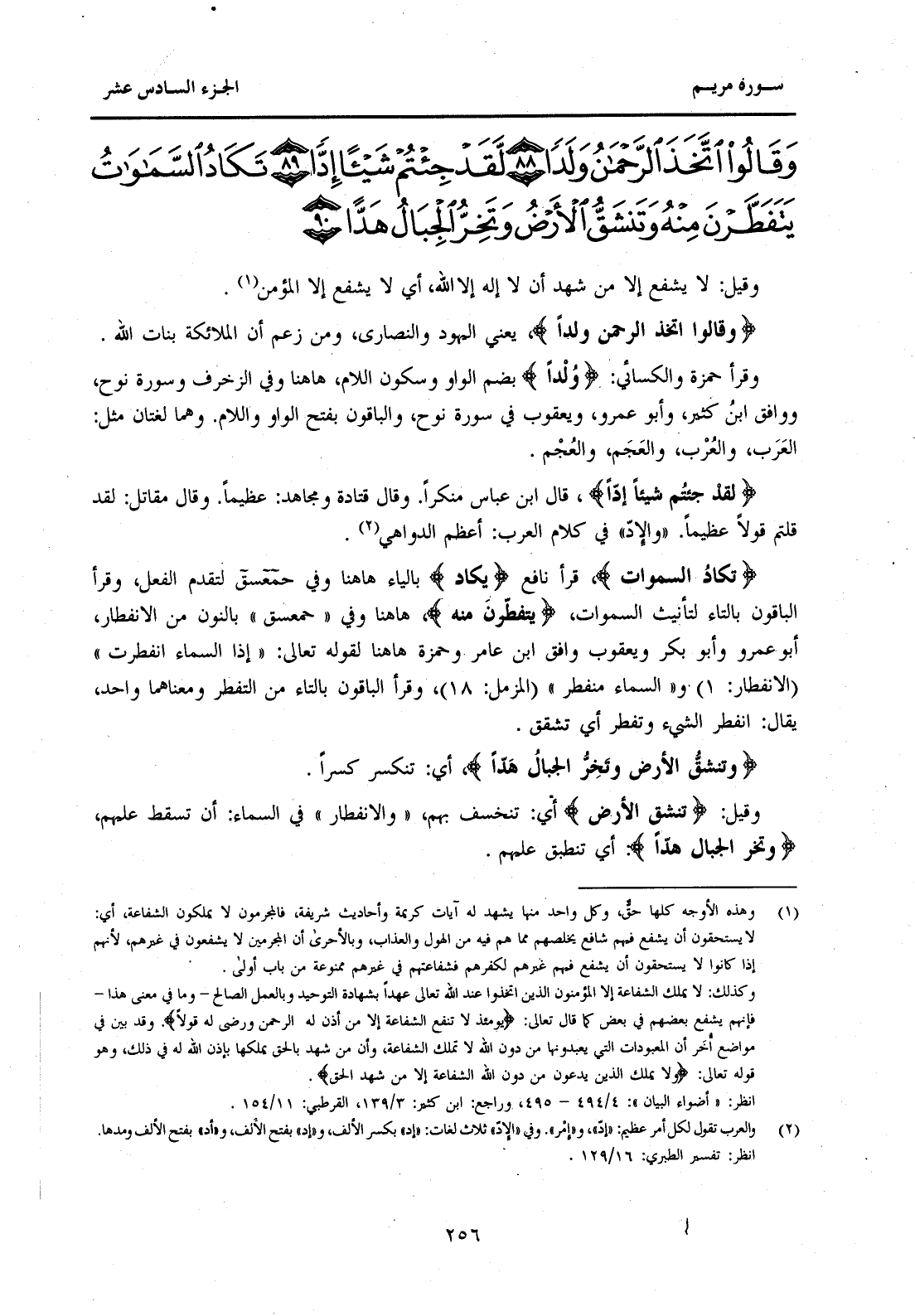 وَقَرَأَ حَمْزَةُ وَالْكِسَائِيُّ " وُلْدًا " بِضَمِّ الْوَاوِ وسكون اللام ها هنا وَفِي الزُّخْرُفِ وَسُورَةِ نُوحٍ وَوَافَقَ ابْنُ كَثِيرٍ وَأَبُو عَمْرٍو وَيَعْقُوبُ فِي سُورَةِ نُوحٍ وَالْبَاقُونَ بِفَتْحِ الْوَاوِ وَاللَّامِ. وَهُمَا لُغَتَانِ مِثْلُ: الْعَرَبِ وَالْعُرْبِ وَالْعَجَمِ وَالْعُجْمِ. {لَقَدْ جِئْتُمْ شَيْئًا إِدًّا} قَالَ ابْنُ عَبَّاسٍ مُنْكَرًا. وَقَالَ قَتَادَةُ وَمُجَاهِدٌ: عَظِيمًا. وَقَالَ مُقَاتِلٌ: لَقَدْ قُلْتُمْ قَوْلًا عَظِيمًا. "وَالْإِدُّ" فِي كَلَامِ الْعَرَبِ: أَعْظَمُ الدَّوَاهِي (2) . {تَكَادُ السَّمَاوَاتُ} قَرَأَ نَافِعٌ " يَكَادُ " بِالْيَاءِ هَاهُنَا وَفِي حم عسق لِتَقَدُّمِ الْفِعْلِ وَقَرَأَ الْبَاقُونَ بِالتَّاءِ لِتَأْنِيثِ السَّمَوَاتِ {يَتَفَطَّرْنَ مِنْهُ} هاهنا وفي "حمعسق" بِالنُّونِ مِنَ الِانْفِطَارِ أَبُو عَمْرٍو وَأَبُو بَكْرٍ وَيَعْقُوبُ وَافَقَ ابْنَ عَامِرٍ وَحَمْزَةَ هَاهُنَا لِقَوْلِهِ تَعَالَى: "إِذَا السَّمَاءُ انْفَطَرَتْ" (الانْفِطَارِ:1) وَ"السَّمَاءُ مُنْفَطِرٌ" (الْمُزَّمِّلِ:18) وَقَرَأَ الْبَاقُونَ بِالتَّاءِ مِنَ التَّفَطُّرِ وَمَعْنَاهُمَا وَاحِدٌ يُقَالُ: انْفَطَرَ الشَّيْءُ وَتَفَطَّرَ أَيْ تَشَقَّقَ.