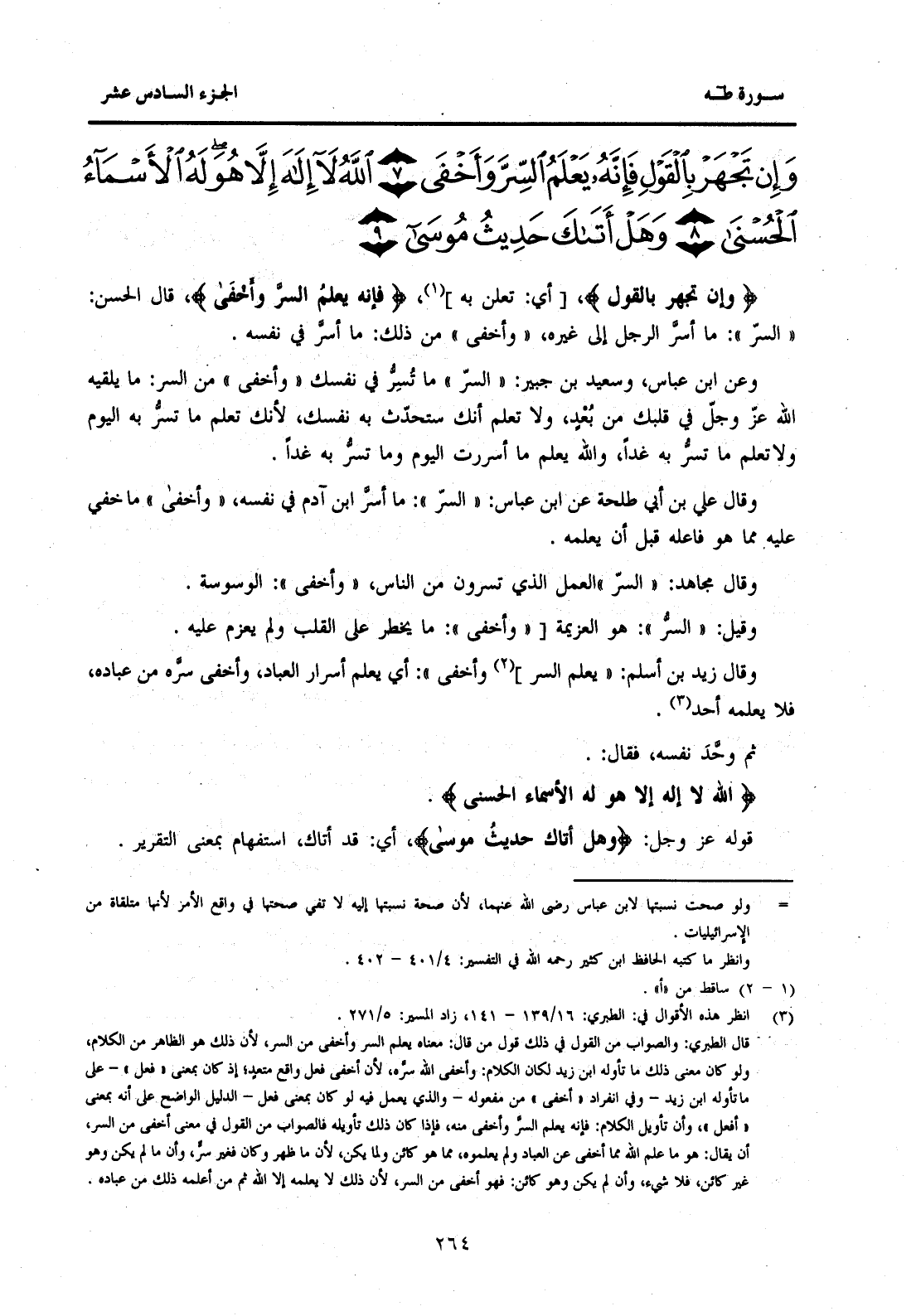 {وَإِنْ تَجْهَرْ بِالْقَوْلِ فَإِنَّهُ يَعْلَمُ السِّرَّ وَأَخْفَى (7) اللَّهُ لَا إِلَهَ إِلَّا هُوَ لَهُ الْأَسْمَاءُ الْحُسْنَى (8) وَهَلْ أَتَاكَ حَدِيثُ مُوسَى (9) }