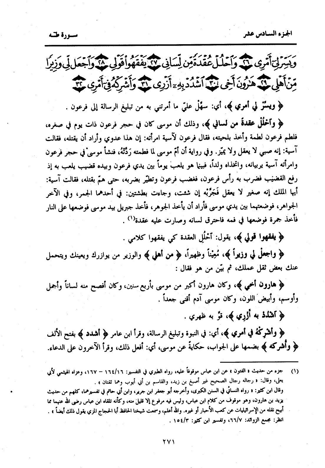 {وَيَسِّرْ لِي أَمْرِي} أَيْ: سَهِّلْ عَلَيَّ مَا أَمَرْتَنِي بِهِ مِنْ تَبْلِيغِ الرِّسَالَةِ إِلَى فِرْعَوْنَ. {وَاحْلُلْ عُقْدَةً مِنْ لِسَانِي} وَذَلِكَ أَنَّ مُوسَى كَانَ فِي حَجْرِ فِرْعَوْنَ ذَاتَ يَوْمٍ فِي صِغَرِهِ، فَلَطَمَ فِرْعَوْنَ لَطْمَةً وَأَخْذَ بِلِحْيَتِهِ، فَقَالَ فِرْعَوْنُ لِآسِيَةَ امْرَأَتِهِ: إِنَّ هَذَا عَدُوِّي وَأَرَادَ أَنْ يَقْتُلَهُ، فَقَالَتْ آسِيَةُ: إِنَّهُ صَبِيٌّ لَا يَعْقِلُ وَلَا يُمَيِّزُ. وَفِي رِوَايَةٍ أَنَّ أُمَّ مُوسَى لَمَّا فَطَمَتْهُ رَدَّتْهُ، فَنَشَأَ مُوسَى فِي حَجْرِ فِرْعَوْنَ وَامْرَأَتِهِ آسِيَةَ يُرَبِّيَانِهِ، وَاتَّخَذَاهُ وَلَدًا، فَبَيْنَمَا هُوَ يَلْعَبُ يَوْمًا بَيْنَ يَدَيْ فِرْعَوْنَ وَبِيَدِهِ قَضِيبٌ يَلْعَبُ بِهِ إِذْ رَفَعَ الْقَضِيبَ فَضَرَبَ بِهِ رَأْسَ فِرْعَوْنَ، فَغَضِبَ فِرْعَوْنُ وَتَطَيَّرَ بِضَرْبِهِ، حَتَّى هَمَّ بِقَتْلِهِ، فَقَالَتْ آسِيَةُ: أَيُّهَا الْمَلِكُ إِنَّهُ صَغِيرٌ لَا يَعْقِلُ فَجَرِّبْهُ إِنْ شِئْتَ، وَجَاءَتْ بِطَشْتَيْنِ: فِي أَحَدِهِمَا الْجَمْرُ، وَفِي الْآخَرِ الْجَوَاهِرُ، فَوَضَعَتْهُمَا بَيْنَ يَدَيْ مُوسَى فَأَرَادَ أَنْ يَأْخُذَ الْجَوَاهِرَ، فَأَخَذَ جِبْرِيلُ بِيَدِ مُوسَى فَوَضَعَهَا عَلَى النَّارِ فَأَخَذَ جَمْرَةً فَوَضَعَهَا فِي فَمِهِ فَاحْتَرَقَ لِسَانُهُ وَصَارَتْ عَلَيْهِ عُقْدَةٌ (1) . {يَفْقَهُوا قَوْلِي} يَقُولُ: احْلُلِ الْعُقْدَةَ كَيْ يَفْقَهُوا كَلَامِي. {وَاجْعَلْ لِي وَزِيرًا} مُعِينًا وَظَهِيرًا، {مِنْ أَهْلِي} وَالْوَزِيرُ مَنْ يُوَازِرُكَ وَيُعِينُكَ وَيَتَحَمَّلُ عَنْكَ بَعْضَ ثِقَلِ عَمَلِكَ، ثُمَّ بَيَّنَ مَنْ هُوَ فَقَالَ: {هَارُونَ أَخِي} وَكَانَ هَارُونُ أَكْبَرَ مِنْ مُوسَى بِأَرْبَعِ سِنِينَ، وَكَانَ أَفْصَحَ مِنْهُ لِسَانًا وَأَجْمَلَ وَأَوْسَمَ، وَأَبْيَضَ اللَّوْنِ، وَكَانَ مُوسَى آدَمَ أَقْنَى جَعْدًا. {اشْدُدْ بِهِ أَزْرِي} قَوِّ بِهِ ظَهْرِي. {وَأَشْرِكْهُ فِي أَمْرِي} أَيْ: فِي النُّبُوَّةِ وَتَبْلِيغِ الرِّسَالَةِ، وَقَرَأَ ابْنُ عَامِرٍ "أَشْدُدْ" بِفَتْحِ الْأَلِفِ "وَأُشْرِكْهُ " بِضَمِّهَا عَلَى الْجَوَابِ، حِكَايَةً عَنْ مُوسَى، أَيْ: أَفْعَلُ ذَلِكَ، وَقَرَأَ الْآخَرُونَ عَلَى الدُّعَاءِ.