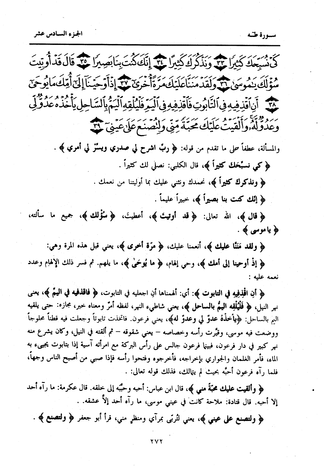{كَيْ نُسَبِّحَكَ كَثِيرًا} قَالَ الْكَلْبِيُّ: نُصَلِّي لَكَ كَثِيرًا. {وَنَذْكُرَكَ كَثِيرًا} نَحْمَدُكَ وَنُثْنِي عَلَيْكَ بِمَا أَوْلَيْتَنَا مِنْ نِعَمِكَ. {إِنَّكَ كُنْتَ بِنَا بَصِيرًا} خَبِيرًا عَلِيمًا. {قَالَ} اللَّهُ تَعَالَى: {قَدْ أُوتِيتَ} أُعْطِيتَ، {سُؤْلَكَ} جَمِيعَ مَا سَأَلْتَهُ، {يَا مُوسَى} {وَلَقَدْ مَنَنَّا عَلَيْكَ} أَنْعَمْنَا عَلَيْكَ، {مَرَّةً أُخْرَى} يَعْنِي قَبْلَ هَذِهِ الْمَرَّةِ وَهِيَ: {إِذْ أَوْحَيْنَا إِلَى أُمِّكَ} وَحْيُ إِلْهَامٍ، {مَا يُوحَى} مَا يُلْهَمُ. ثُمَّ فَسَّرَ ذَلِكَ الْإِلْهَامَ وَعَدَّدَ نِعَمَهُ عَلَيْهِ: {أَنِ اقْذِفِيهِ فِي التَّابُوتِ} أَيْ: أَلْهَمْنَاهَا أَنِ اجْعَلِيهِ فِي التَّابُوتِ، {فَاقْذِفِيهِ فِي الْيَمِّ} يَعْنِي نَهْرَ النِّيلِ، {فَلْيُلْقِهِ الْيَمُّ بِالسَّاحِلِ} يَعْنِي شَاطِئَ النَّهْرِ، لَفْظُهُ أَمْرٌ وَمَعْنَاهُ خَبَرٌ، مَجَازُهُ: حَتَّى يُلْقِيَهُ الْيَمُّ بِالسَّاحِلِ: {يَأْخُذْهُ عَدُوٌّ لِي وَعَدُوٌّ لَهُ} يَعْنِي فِرْعَوْنَ. فَاتَّخَذَتْ تَابُوتًا وَجَعَلَتْ فِيهِ قُطْنًا مَحْلُوجًا وَوَضَعَتْ فِيهِ مُوسَى، وَقَيَّرَتْ رَأْسَهَ وَخَصَاصَهُ -يَعْنِي شُقُوقَهُ -ثُمَّ أَلْقَتْهُ فِي النِّيلِ، وَكَانَ يَشْرَعُ مِنْهُ نَهْرٌ كَبِيرٌ فِي دَارِ فِرْعَوْنَ، فَبَيْنَمَا فِرْعَوْنُ جَالِسٌ عَلَى رَأْسِ الْبِرْكَةِ مَعَ امْرَأَتِهِ آسِيَةَ إِذْ بِتَابُوتٍ يَجِيءُ بِهِ الْمَاءُ، فَأَمَرَ الْغِلْمَانَ وَالْجَوَارِيَ بِإِخْرَاجِهِ، فَأَخْرَجُوهُ وَفَتَحُوا رَأْسَهُ فَإِذَا صَبِيٌّ مِنْ أَصْبَحِ النَّاسِ وَجْهًا، فَلَمَّا رَآهُ فِرْعَوْنُ أَحَبَّهُ بِحَيْثُ لَمْ يَتَمَالَكْ، فَذَلِكَ قَوْلُهُ تَعَالَى: